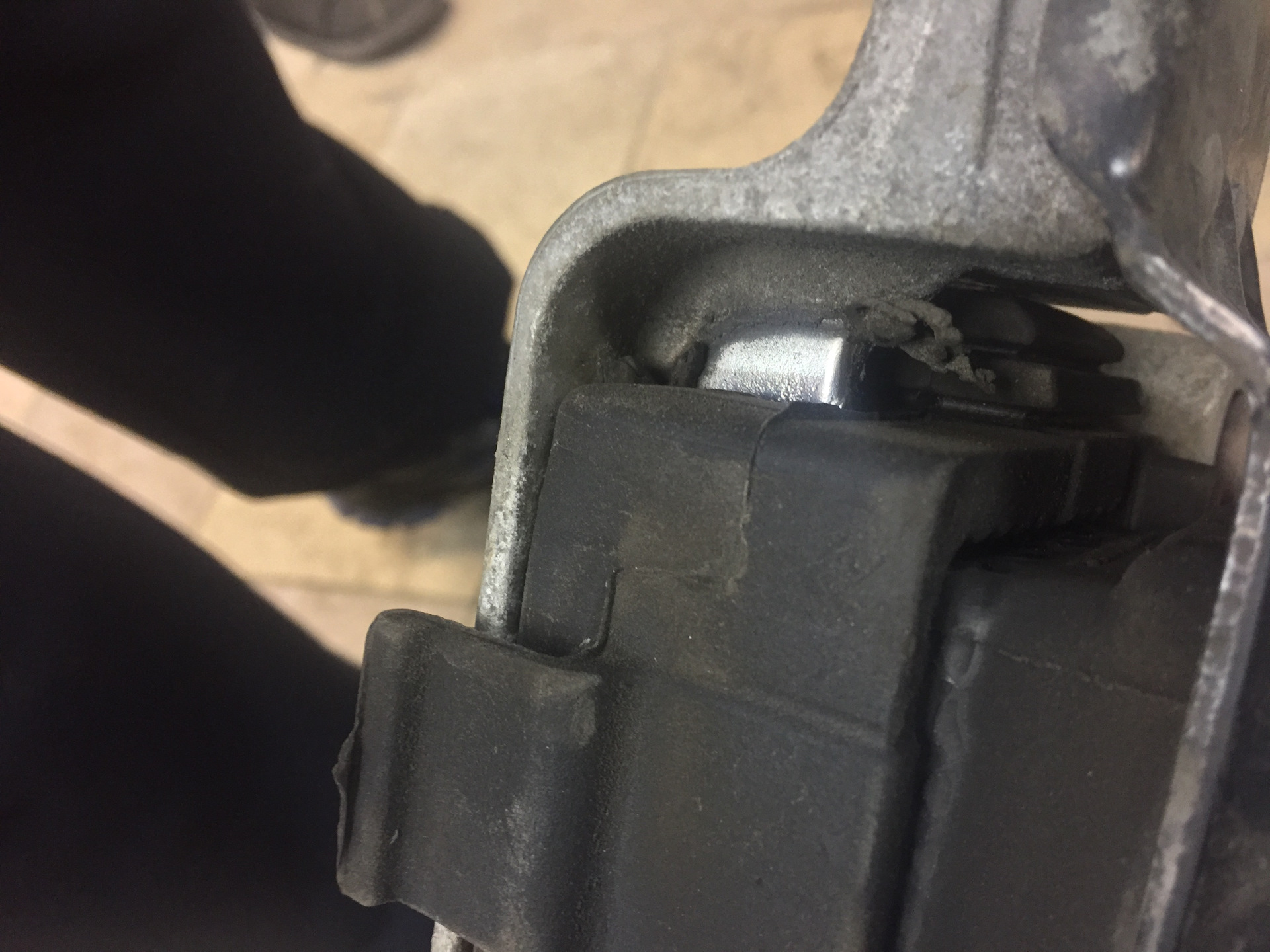 После того как все сняли перед нами открывается вид на подушку, который прикрыт всего лишь кабельтрассой, которую отщелкнув фиксаторы спокойно отводим в сторону и болты подушки готовы к откручиванию.