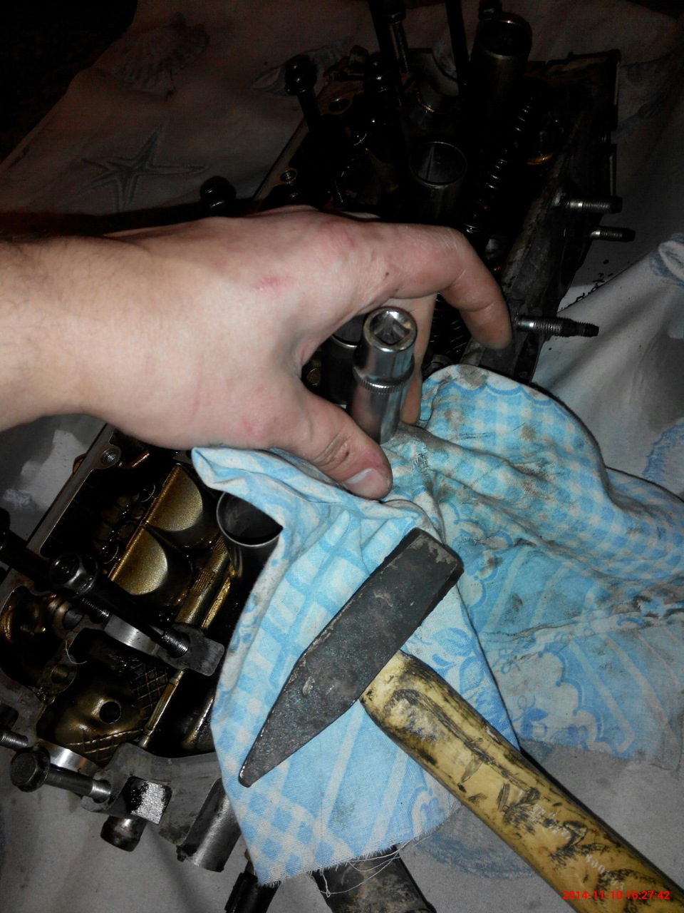 Далее беремся за клапана, так как сразу было видно что нагара на них солидно, решено было все разбирать, чистить клапана, заодно поменять колпачки. Тк спец инструмента у меня не было, воспользовался методом, найденом на ej9.ru, накрываем сверху тканью, чтобы сухари не разлетелись, сверху головку подходящюю и сверху молотком бац!