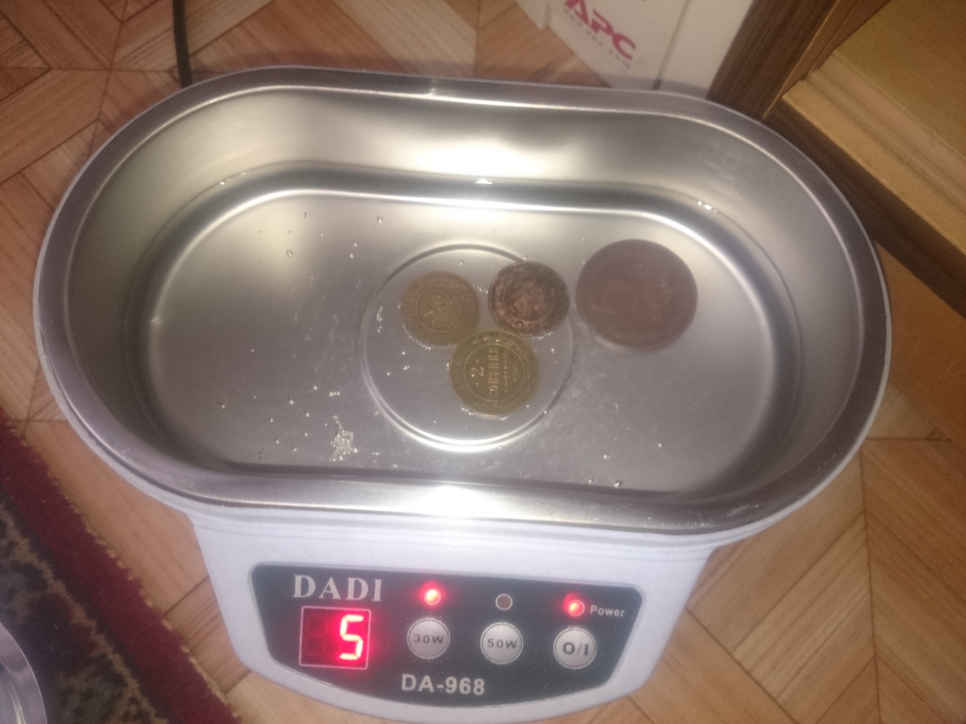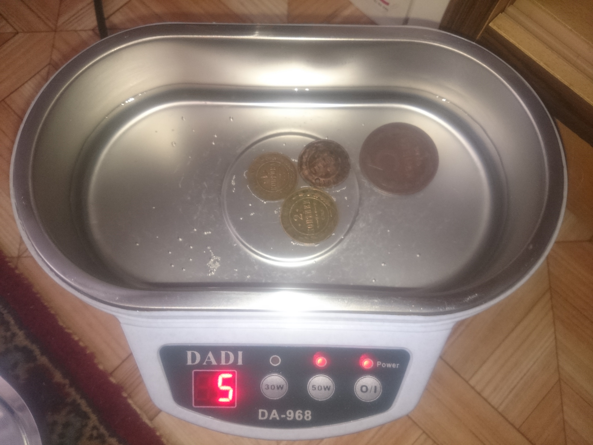 Пришла, налил холодной воды добавил капли 2 ферри (для мытья посуды) закинул монетосы прогнал минут по 5 на 30W и на 50W с Монетосов слетела грязь и зеленоватая патина.