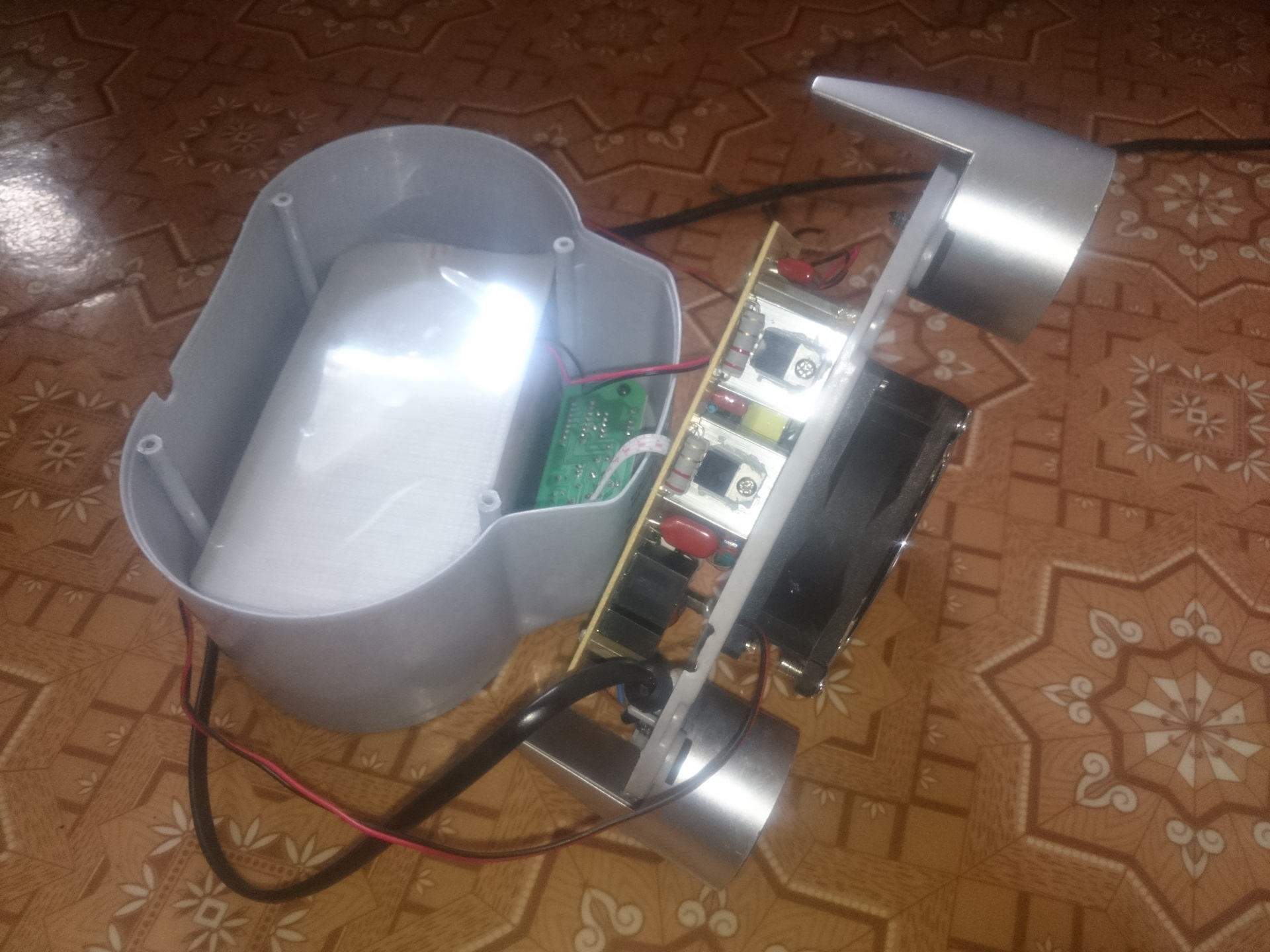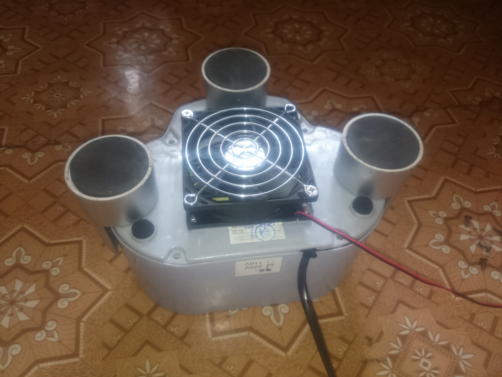 Самым простым оказалось поставить кулер с низу от компьютера что бы он продувал внутреннее пространство ванны. Потом я перевернул плату всеми элементами в низ для лучшего охлаждения трансформатора и диодов — закрепил это все на удлиненные шпильки. Все собрал и прикрутил ножки от какой то колонки.