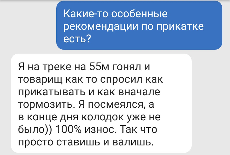 А таки колодка с диском сразу полностью выдают свой результат? Ведь ватные тормоза в первые сотни километров просто опасны.