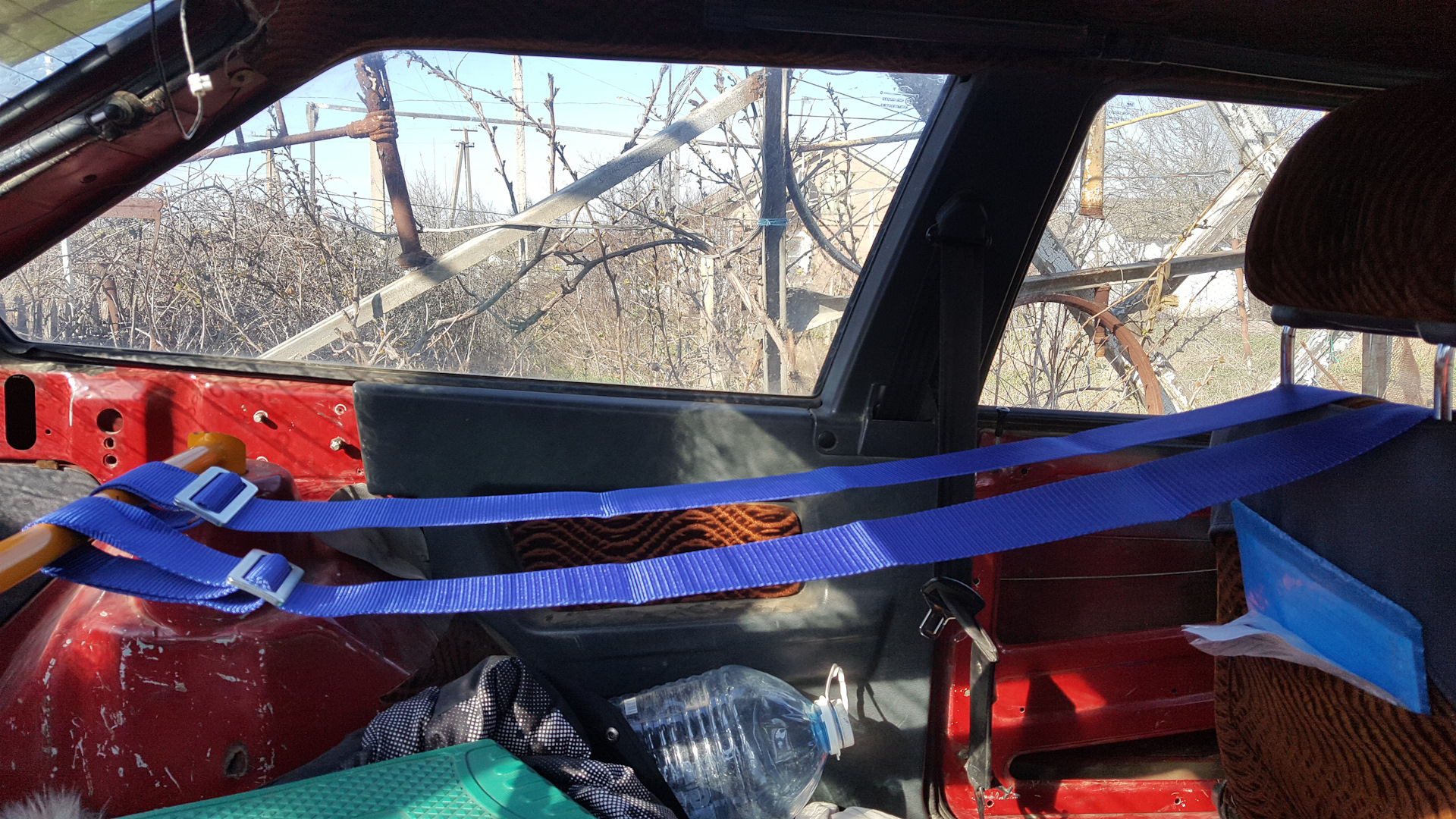 просверлить крышу (всё равно там скоро люк делать) и закрепить рим-болты сверху (чем хорош этот вариант — "верхнюю" пару ремней никогда не придётся искать на полу)