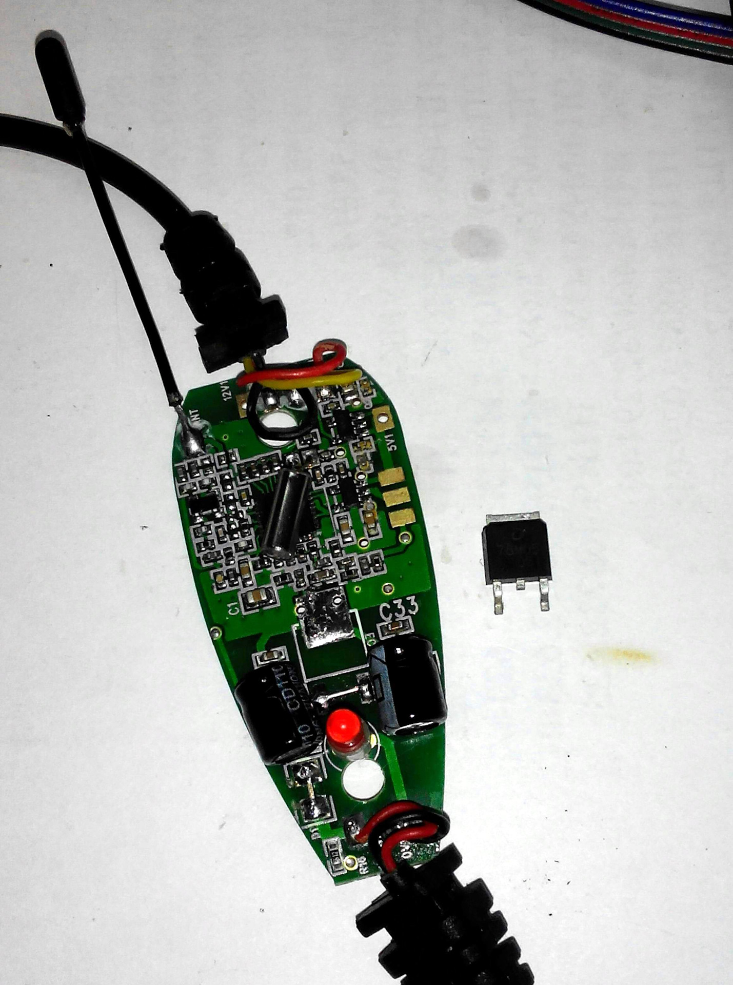 Так как импульсный стабилизатор на 5 вольт мной уже был собран, линейный стабилизатор 78М05 с платы передатчика был демонтирован и заменен перемычкой. Если кому интересно, сам модулятор собран на микросхеме RTC6701.