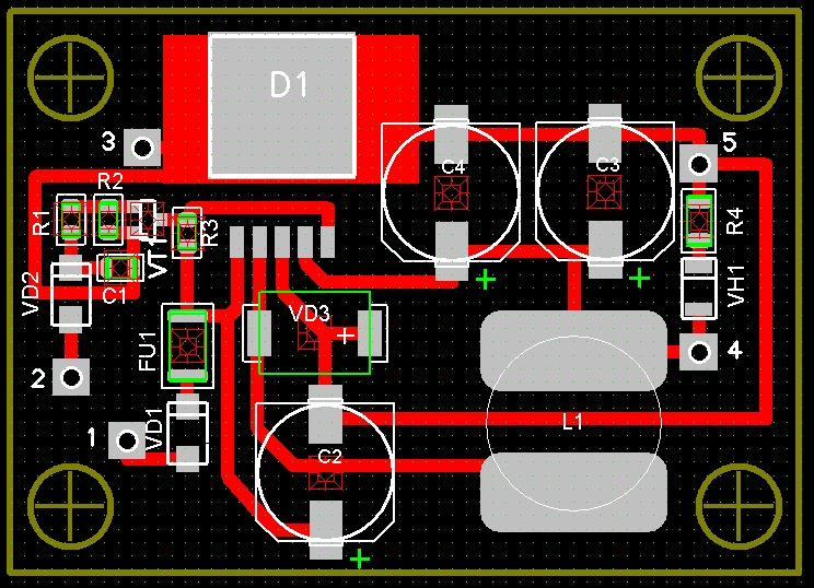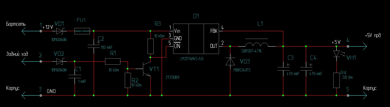 Всем известно, что непосредственно к лампам заднего хода камеру или парктроник подключать нельзя, кто-то запитывает через реле, кто-то через диод с конденсаторами большой емкости, я же сделал управляемый источник питания c выходным напряжением 5V. Питается он от бортсети, а включается/выключается напряжением от ламп заднего хода.