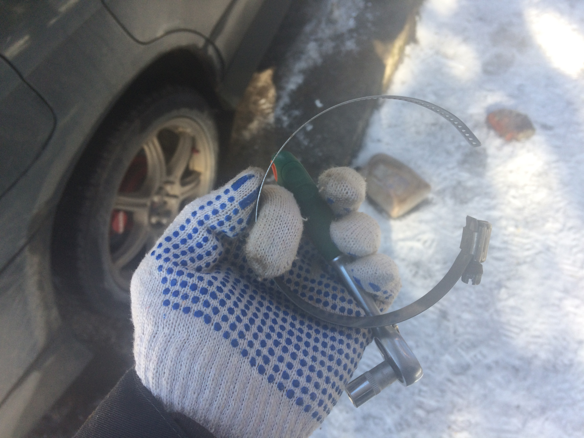 Делать не чего, масло слито, эстакада в 10 км до ближайшего магазина, надо как то срывать фильтр. На ум пришло только одно, снимать хомут с впуска, опоясывать фильтр и какую нибудь загибулину в виде рычага и срывать. В моем случае этой загибулиной был крепеж защиты.