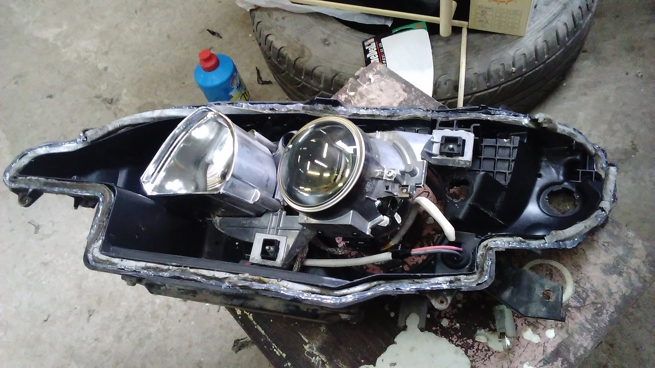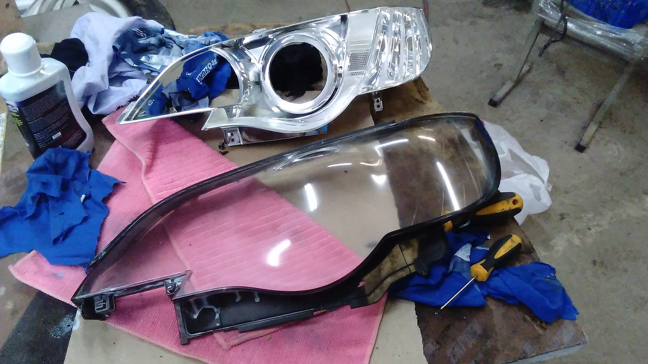 Дальше разбор фары. Сзади фары выкручиваем шурупы и стеко теперь держится только на своем внутренном уплотнителе. Надо аккуратно нагреть стелко по периметру, одновременно поддевая стекло плоской отверткой. Мы делали это вдвоем с другом.Главное не спешить, внутри там нет как такового герметика, там какая то странная лента типа лизуна и от нагрева она становится весьма эластичной и стекло в итоге отходит от фары. При разборе лучше сразу согнать этот уплотнитель в паз, т.к. собирать потом тоже на него.