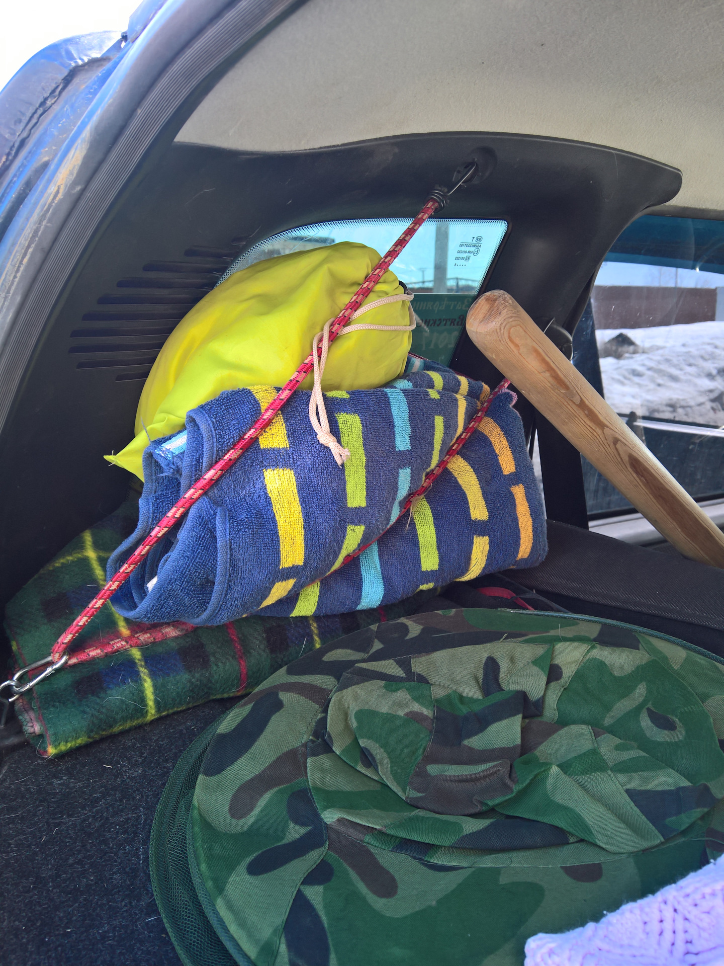 Вобщем пятая дверь организована при помощи крючков от солнцезащитных козырьков и резинок для 9 расширительного бачка, и включает: Лопату фискарс, переколхоженую под черенок для удобство размещения, топор, пилу, провода, и органайзера под мелочь. Да, и знак аварийный там же.