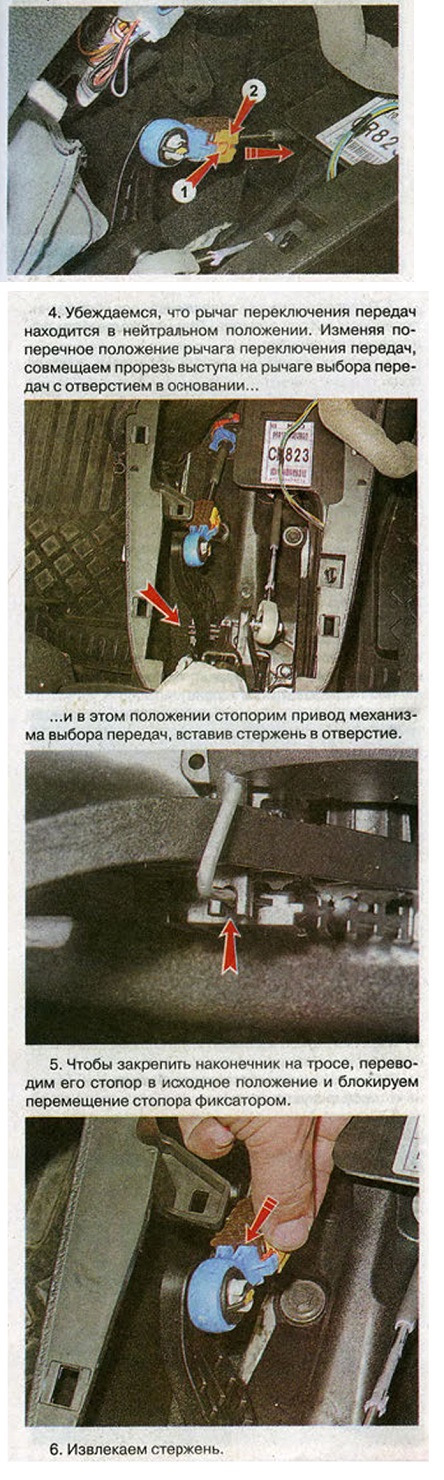 Значит из инструмента только руки. Вскрыл пациента посмотрел на какой ход выдвигается шток (трос наверное правильней), сдвинул фиксатор красный, желтый фиксатор вытащил (с радости чуть не вырвал, всё так легко, полностью он не снимается), рукой подтянул шток (трос) во внутрь фиксатора на то расстояние которое было прикинуто, застопорил зафиксировал. Собрал всё обратно иииии ураааа усе как по маслу. Хотя сижу и думаю а что теперь с другими передачами ? Не заводя переключился по всем — усё в норме. Поехал попереключал — всё в норме… И я рад ух как рад что всё хорошо :)