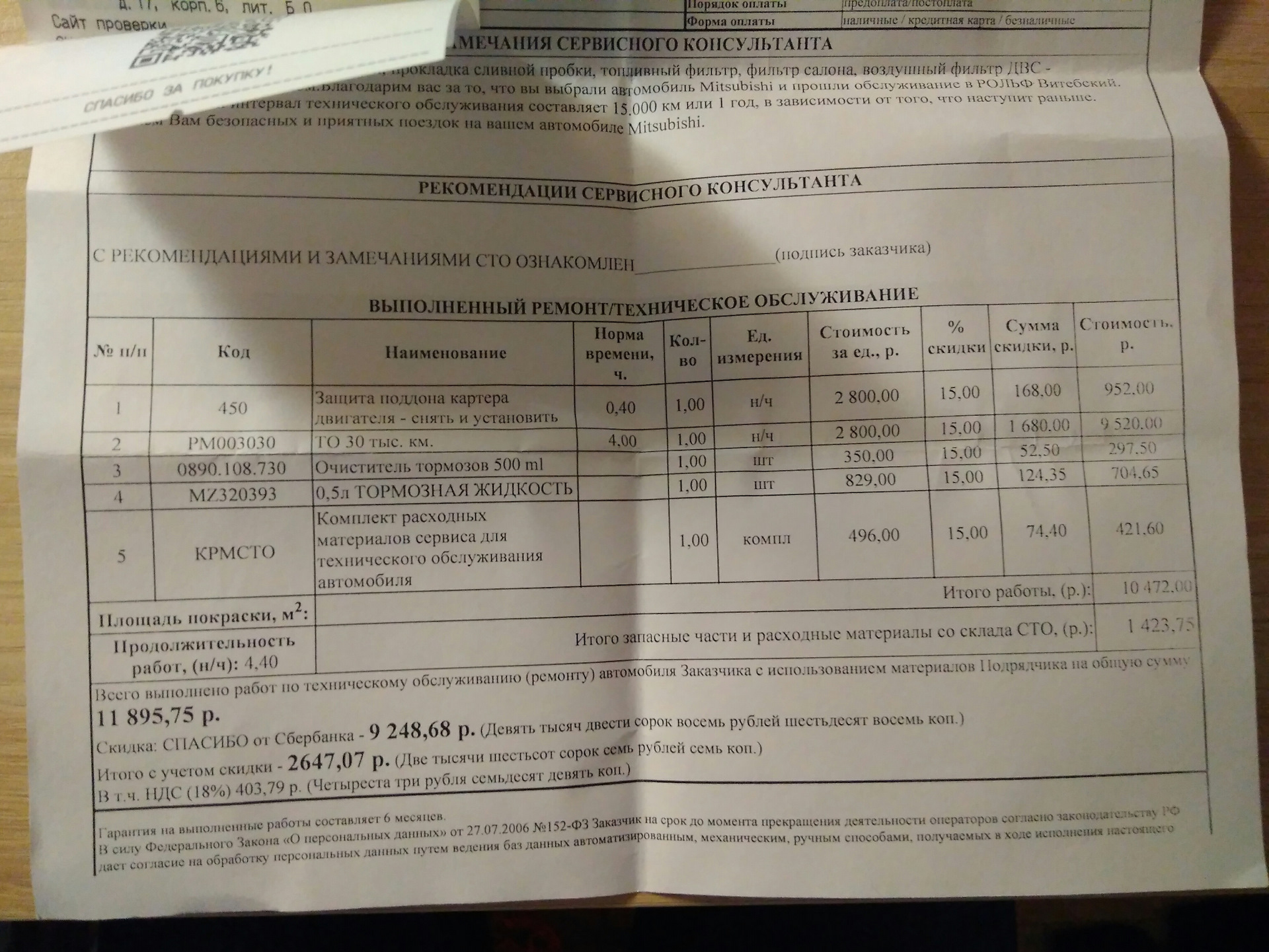 Теперь про стоимость. Масло — Mobil1 ESP Formula 5W-30 — покупал в Финляндии, после возврата инвойса, по мартовскому курсу получается 476,1 руб/литр. При замене расходуется 8,4 литра, итого на 4000 руб, без нескольких копеечек. Фильтры купил заранее, через интернет на сумму 2343 руб. Рольф оценил свой вклад в ТО суммой 11895,75 руб (с учетом скидки 15% за мой недавний день рождения). Итого — 18238,75 руб. Но! Рольф принимает к оплате бонусы Спасибо от Сбербанка! И узнав об этом, я возрадовался, ибо вменяемо потратить эти самые Спасибы ранее я мог только в БургерКинге. А тут вон как пригодились! На тот момент имел больше 9000 Спасиб, что позволило существенно уменьшить сумму к оплате.