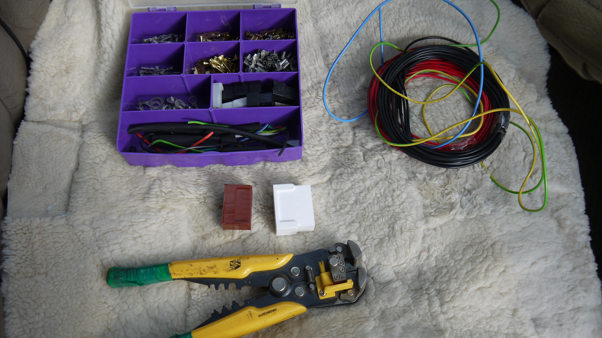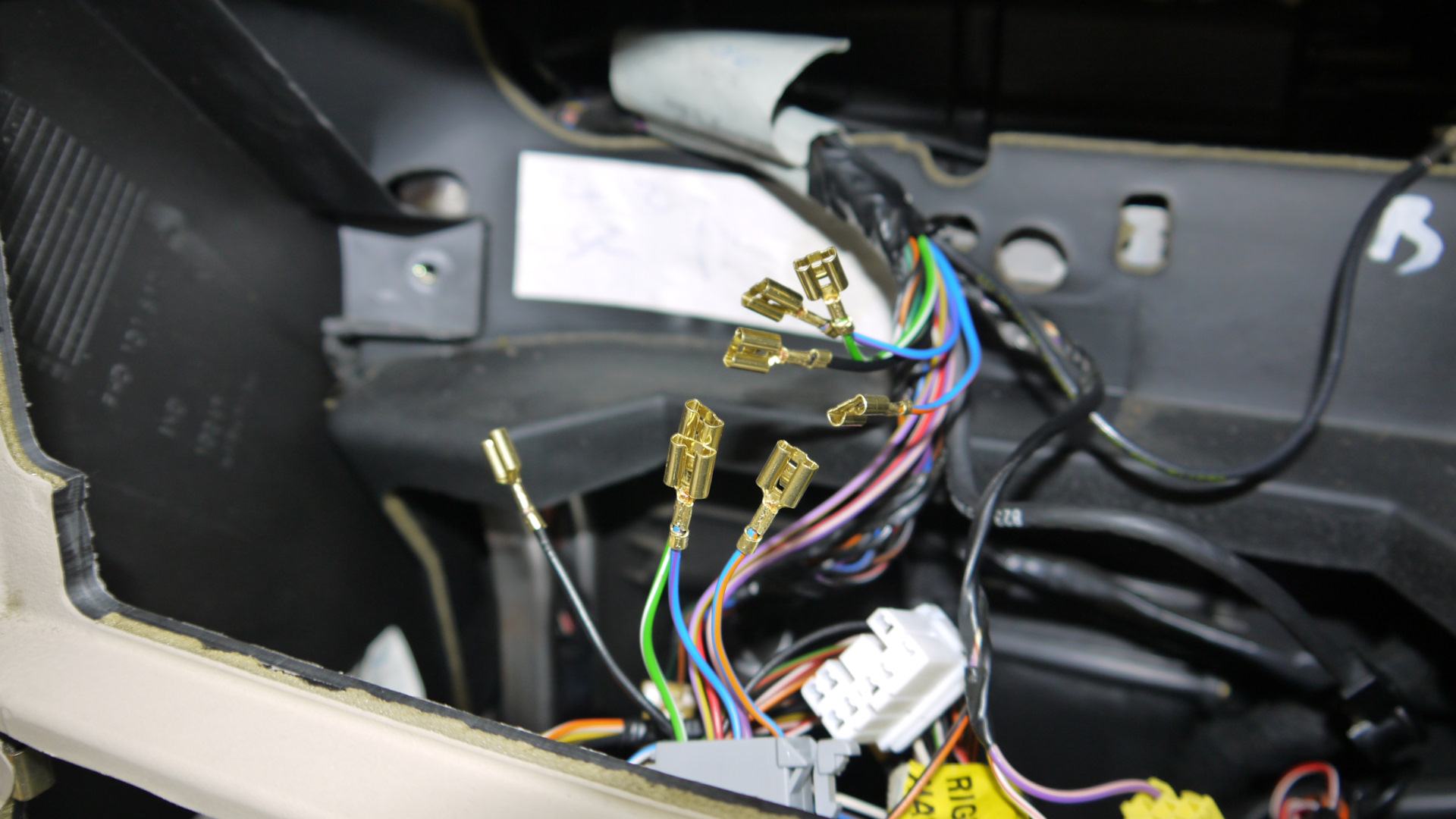 На адаптере зачистил и обжал так же клеммы 6,3 но уже папы. Красный провод +12V ACC, черный масса, зеленый на кнопки управления соединяем с сине-оранживым проводом. Второй провод сине-фиолетовый соединяем с массой. Синей и белый провода адаптера заизолировал изолентой. Получился вот такой адаптер с колодкой.