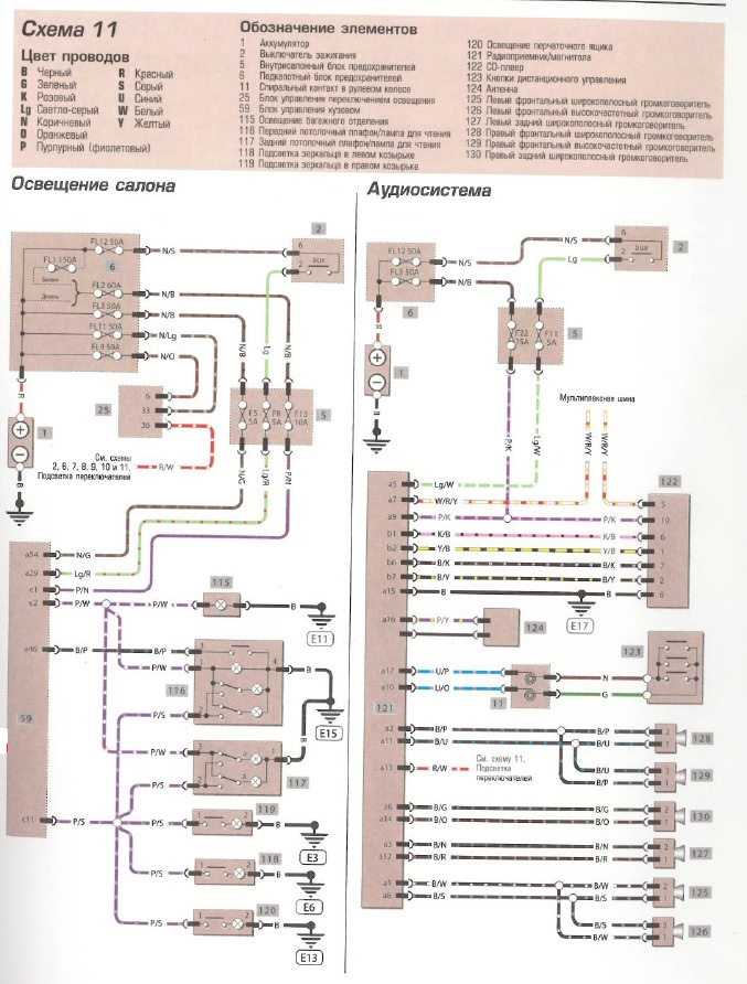 Вынимаем магнитолу, отключаем антенну и еще какой то разъем (так и незнаю, что это Подскажите!). Перед нами 3 фишки Желтый-Зеленый-Синий подключено всего 2 провода данные провода нас не интересуют. Заними Iso разъем первая темно-желтая колодка это колонки. Потом идет серая колодка, вот она нам и нужна, ищем провода отвечающие за кнопки на руле. На помощь приходит схема из нашей книге: