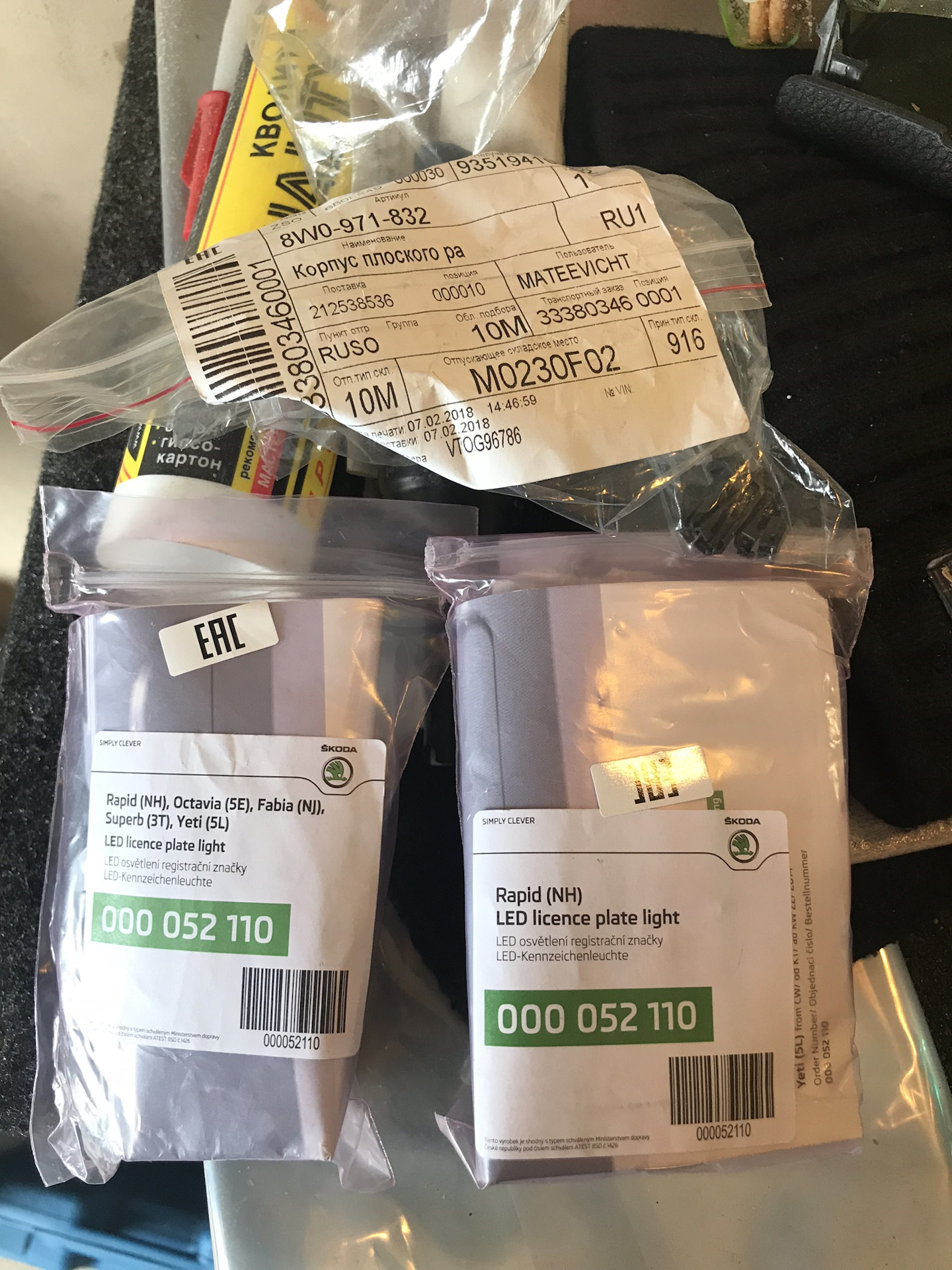 Давно ездил с "моргающей" подсветкой номера. Как меня достали эти недодиоды с китая, я уже кучу ламп перепробовал, погорят нормально месяц-другой и начинается дискотека — то горят, то не горят, то стробоскопят…тьфу, достала эта херня уже. И как то увидел в бж что люди ставят оригинальные шкодовские диоды от rapid. Так как горят хорошо, стоят не дорого. И решил себе тоже заказать и покончить с этим геморроем.