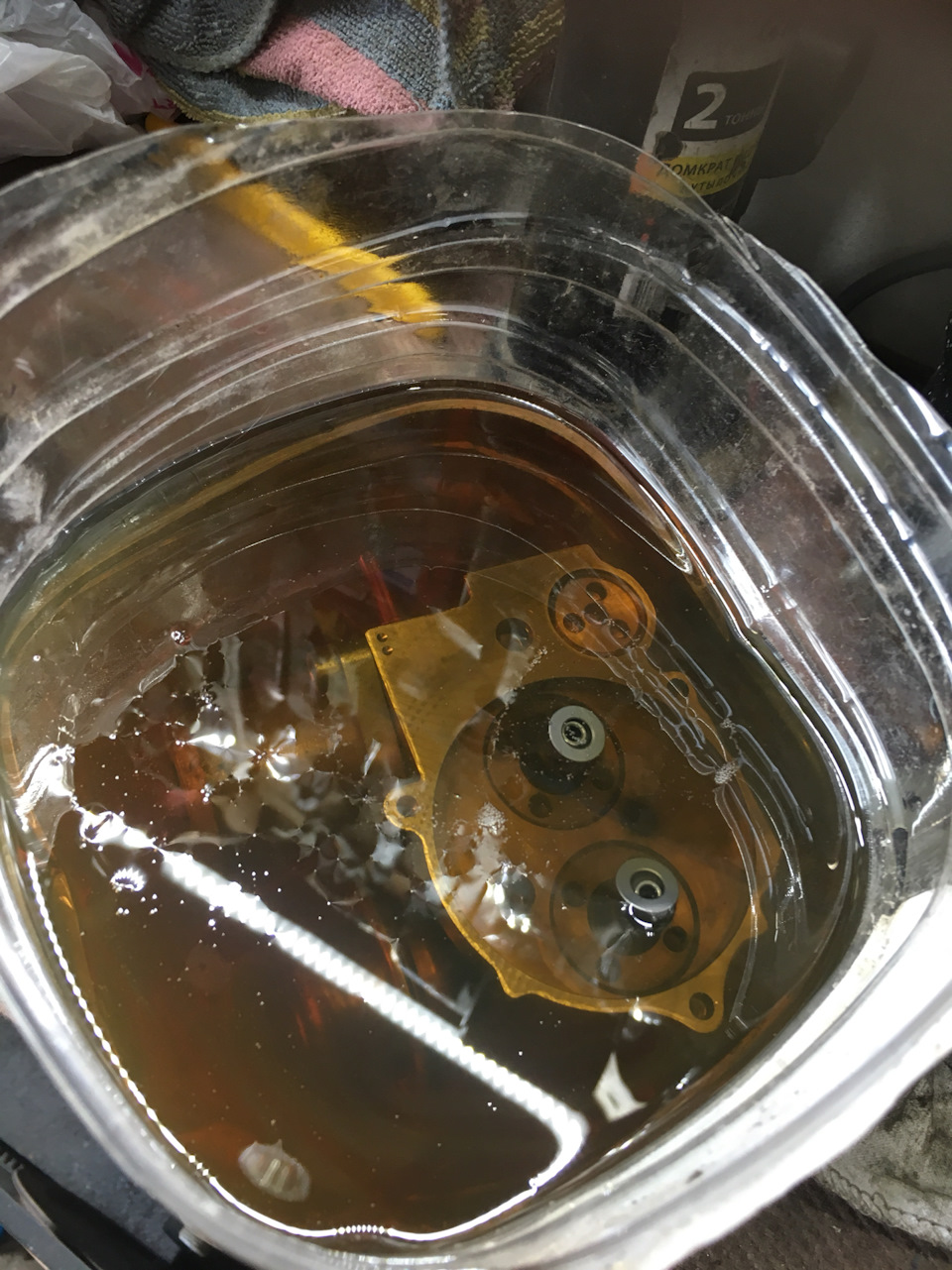 Далее) взяли баклажку 5л., разрезаем пополам, наливаем 1.5 литра Масла (я брал то, что лью в мотор), окунаем, уже разобранный и почищенный, и начинаем шприцом задавливать масло во все дырки😩🤦♂️(технологические отверстия)