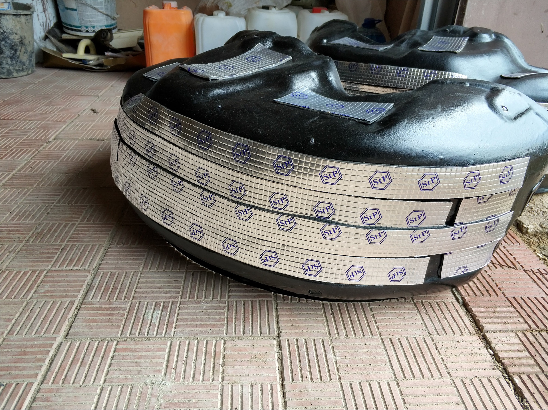 1) Подкрылки растопыреваем, ставим поудобнее на что-нибудь, обезжириваем уайт спиритом и красим резино-битумной мастикой прям жирно жирно. Я в течение 3х дней это делал. Ушло 3,5 баллона мастики на оба подкрылка. Еще пару дней сохли. В итоге мастика схватилась и стала как пластик. Подкрылки потяжелели.