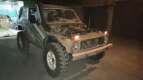 На втором круге упираемся в очередь, почти стандартные нивы заняли все траектории, объехать никак. Пока ждём отламываем до конца глушитель и аккуратно кладём его за ленту, забрали после гонки, мусорить не хорошо!
