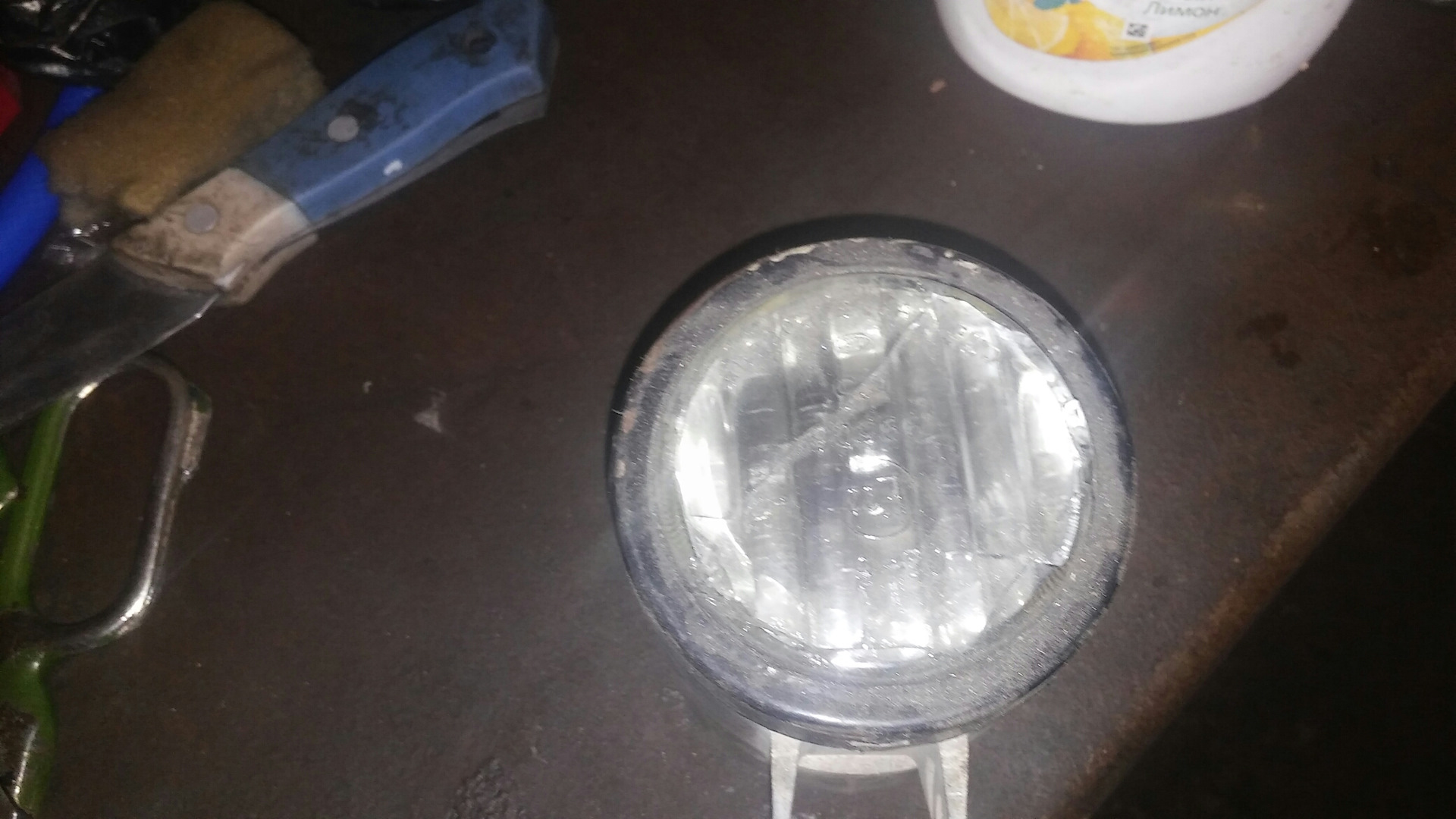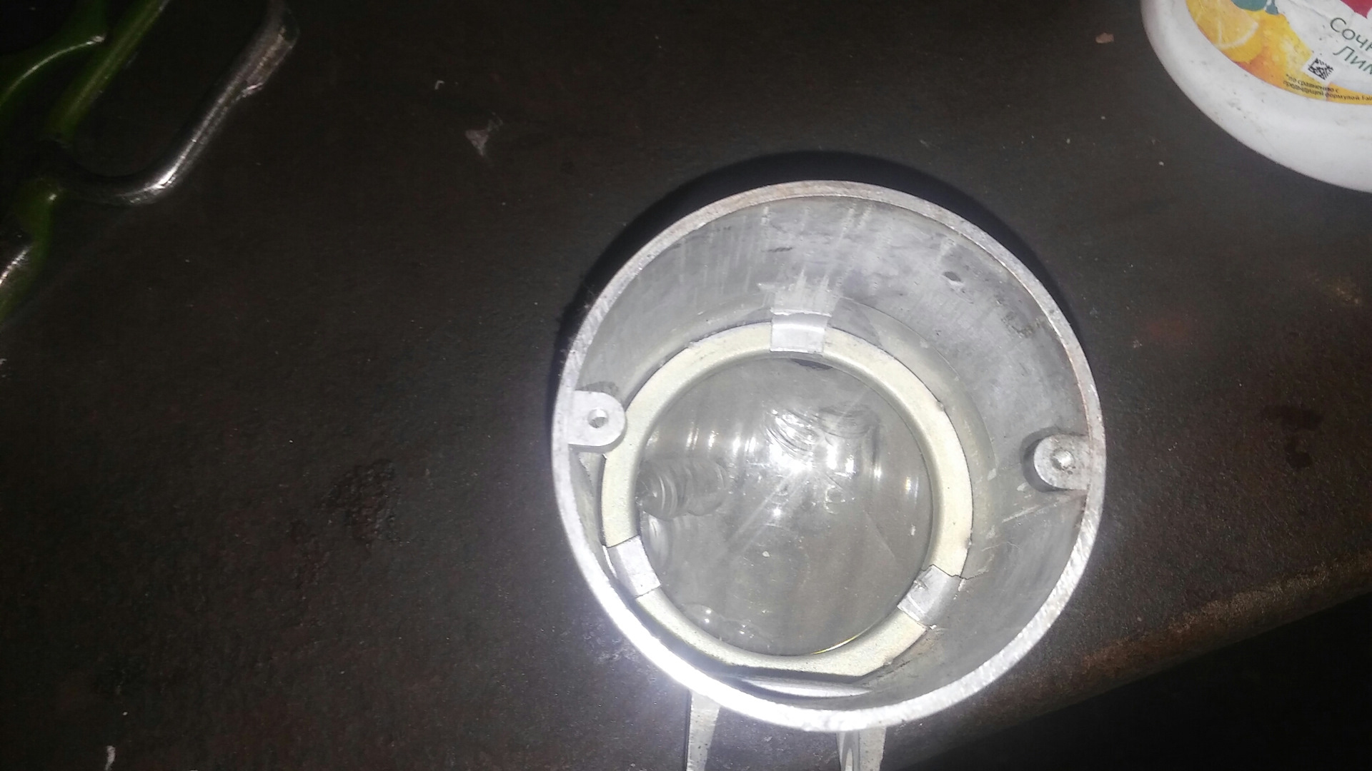 Я также внутрянку почистил, крепление лампы развернул на 90°, получилось лампа не поперек а пряма направлена. А чтобы лучше стал отражатель внутрь впихнул отрезки полированного металлического как зеркало полотна (можно зеркальную нержавейку), свернул в трубку и запихнул внутрь. Она пружинистая — встала как и было, свет ПТФ нормальный получился. Стекла приклеил, края и корпус загрунтовал и покрасил краской серебряной для дисков и все. Ещё после установки слегка к земле наклонил.