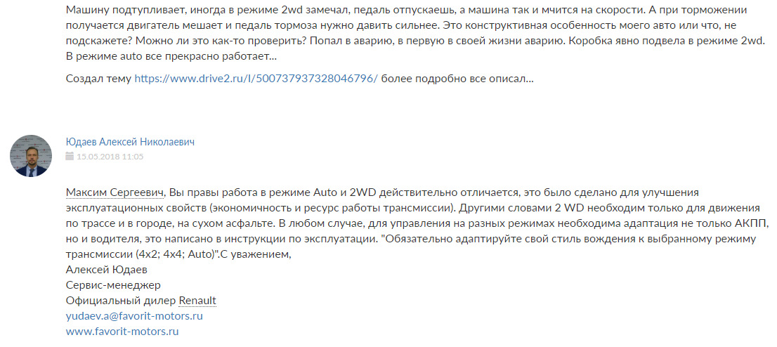 Может быть я чего-то не понимаю, но точно чувствую машину, и точно понимаю, что коробка акпп на режиме 2WD тупит и ведет себя не адекватно. Такие ощущения, что передаточные числа каким-то волшебным образом меняются и машина переключается в не подходящий момент или скорость залипает при том что газ отпущен и уже даже начинаешь тормозить. Пример: вы начинаете тормозить, а скорость не сбрасывается, т.е. фактически двигатель препятствует торможению какое-то время, отсюда и размышления на тему хреновые тормоза у дастера. Но такого не может быть, зимой-то было всё в порядке. Мне писали, что коробка должна адаптироваться под меня, а я под неё. С режимом AUTO так и случилось, машину я зауважал больше, чувствую её лучше, она слушается меня, я слушаюсь ее ))).