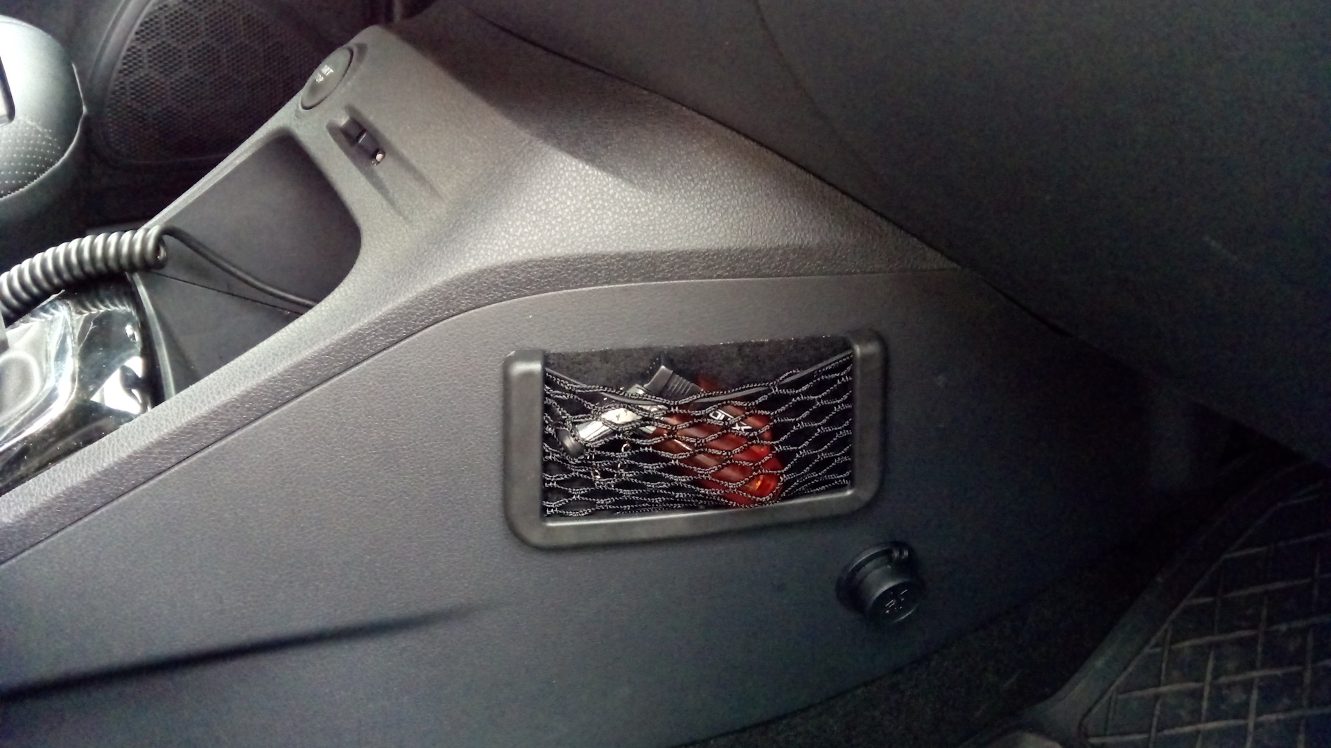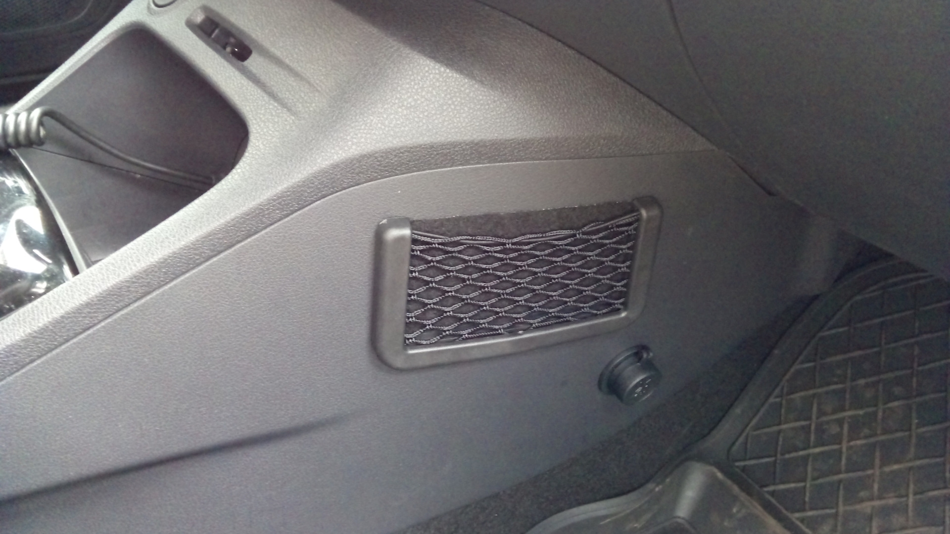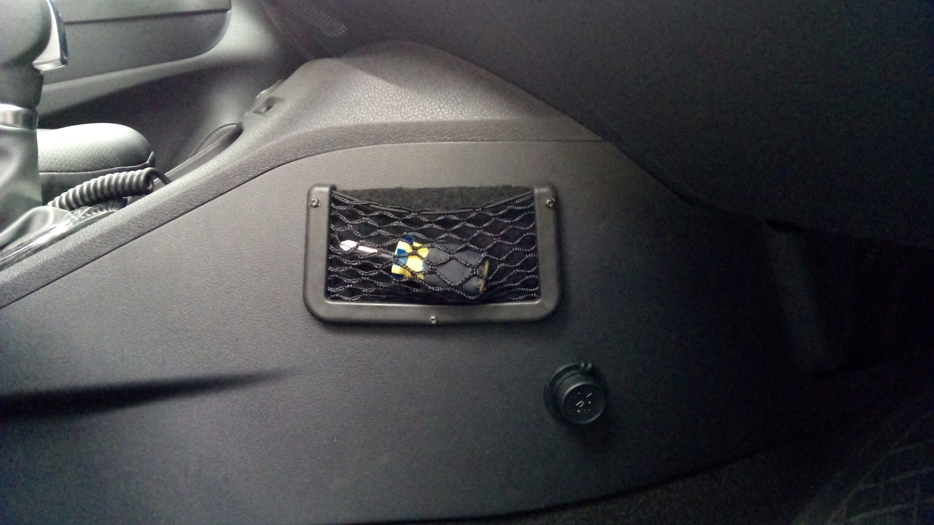 Выбрал место, вырезал из карпета "заднюю" спинку, шоб не громыхало в карманчике содержимое о пластик, сменил штатный скотч на 3м. Ну и во всеоружии, пошёл клеить. всё обезжирил, протёр, прогрел, приклеил, сфоткал для БЖ и… кармашек отвалился! :( Не знаю… то ли скотч такой, т ли пластик хранцузский не приемлет колхоза… так мне и не удалось нормально приклеить эту хрень. Ну нас так просто не возьмёшь ! Там где бессилен заморский скотч, завсегда выручит русский саморез. Пробил в штатных местах дырочки, подобрал чёрненькие саморезики и прифигачил карман надёжно и просто! Так как у меня пассажирская панелька уже и так продырявлена розеткой 12в., то думаю ничего сверх уже ей не страшно :)