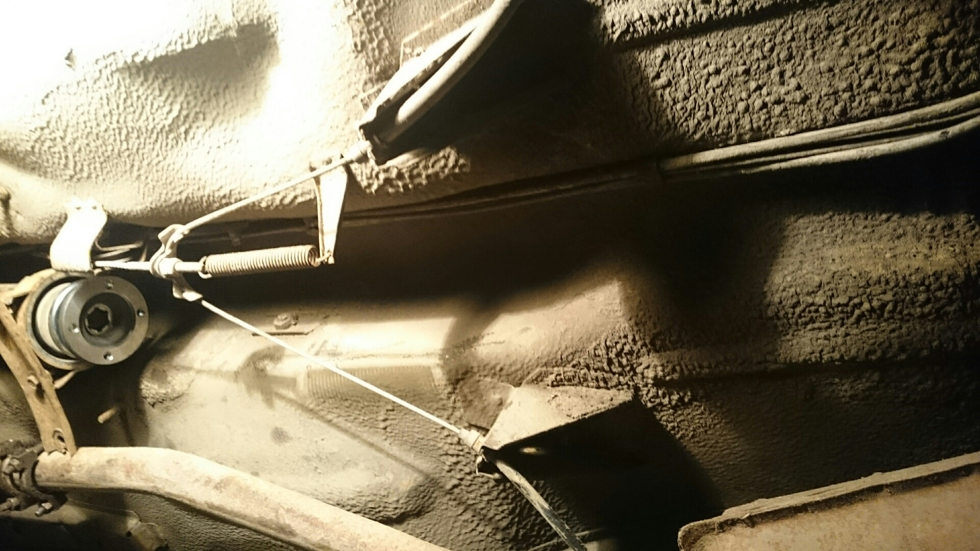 Подвесной подшипник откручен от кузова, у кардана довольно много пространства для маневрирования. А если отсоединить тросик ручника, то вообще всё прекрасно и быстро устанавливается. Но мне было лень это делать, ведь ручник хорошо отрегулирован. Вобщем пришлось понапрягаться. За одно ещё больше согрелся. Шрусокардан на своём месте.