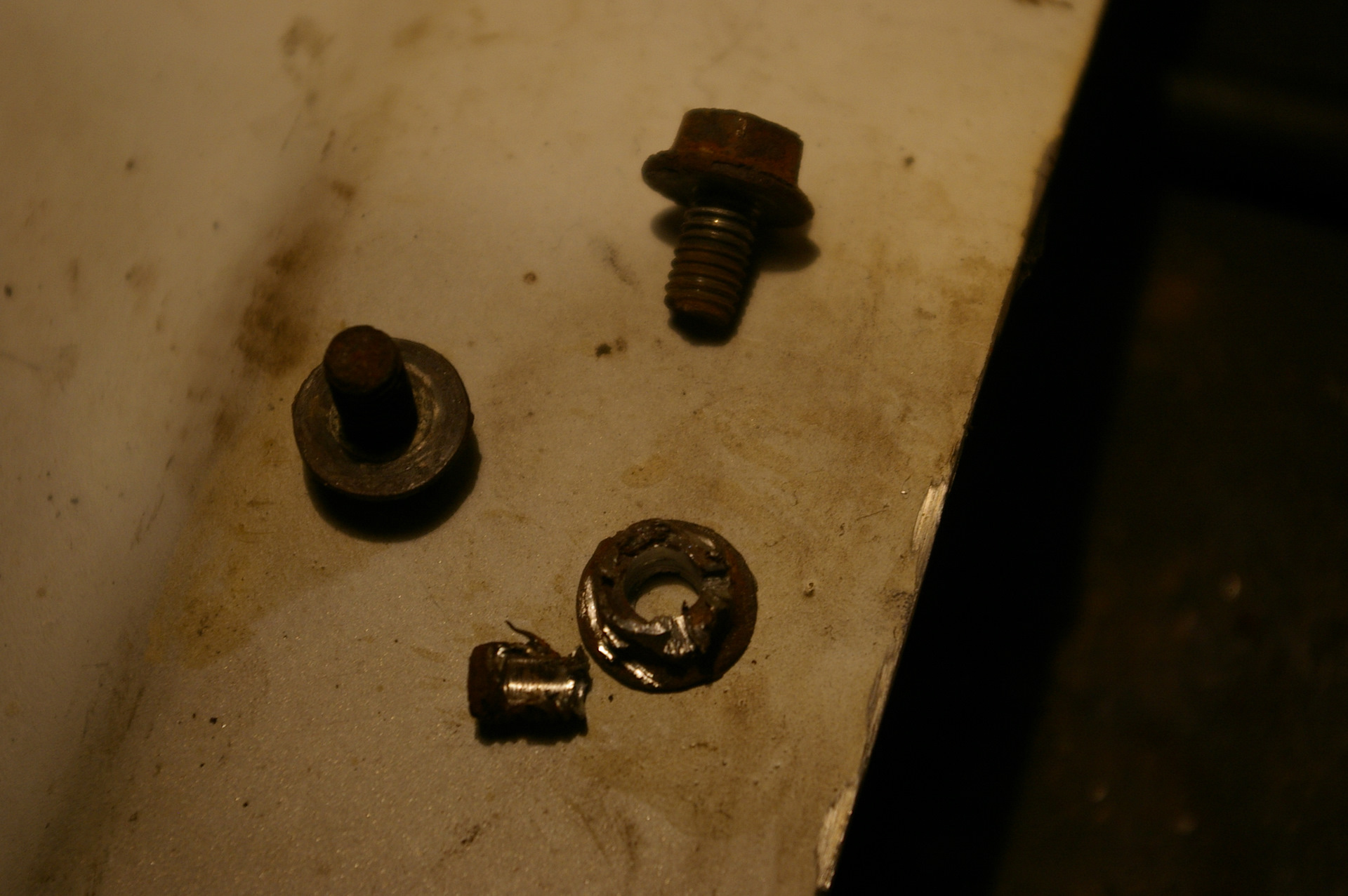 Не насыпешь не переживай. Там так сделано не очень продумано, а может и наоборот. Болты в банк не входят, кольцо в которое они вкручены как-бы приподнято и приваренно, . Посмотри сбоку станет все ясно, там расстояние мм 4-5 есть и там торчат болты. У меня заржавели сами шляпки болтов, головка на 10 снимала рыхлую ржавчину, на 9 не налазила. Специальным сверлом срезал шляпки, зубилом срубил пеньки, высверлил и прогнал резьбу, резьбы там 3нитки. Очень тонкая пластина.