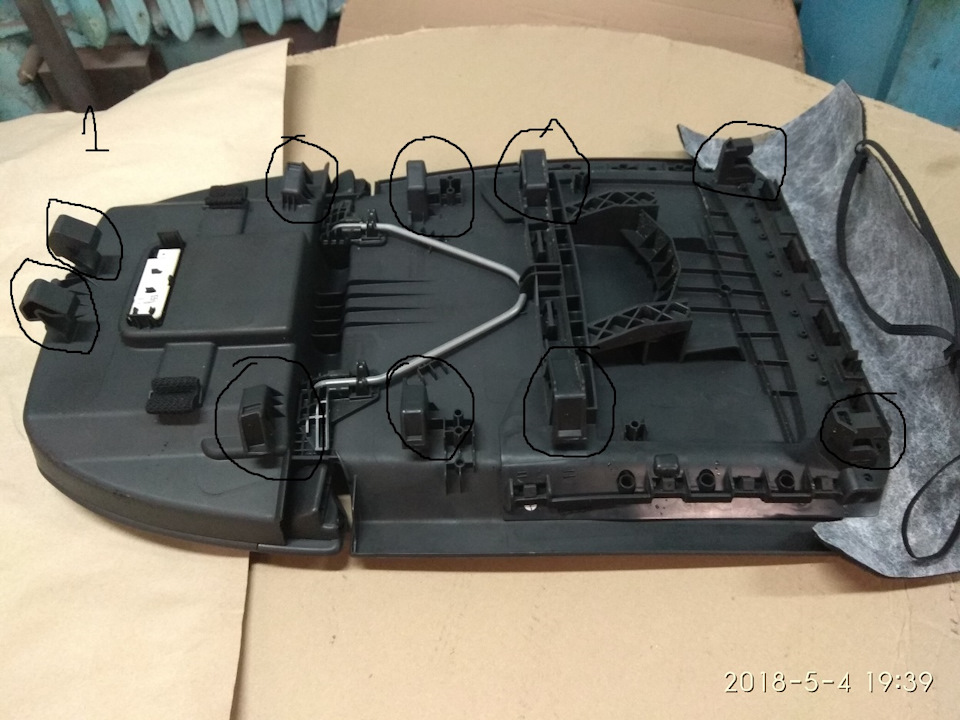 для снятия подлокотника пришлось снимать заднюю крышку от сидения, она на 10 защелках, сначала отщёлкиваем средние три с одной стороны три с другой, затем оттягиваем среднюю часть на себя и снимаем с нижних защёлок, затем пытаемся подлезть рукой к верхним защёлкам и отщелкнуть их затем отсоединяем разём подсветки. подлокотник к креслу крепится болтом (гайка на 16) и ещё болт головка на 10.фото Также фотки с блоком подогрева сидения и крышка с защёлками.Ремонт делали с товарищем которому огромное спасибо.
