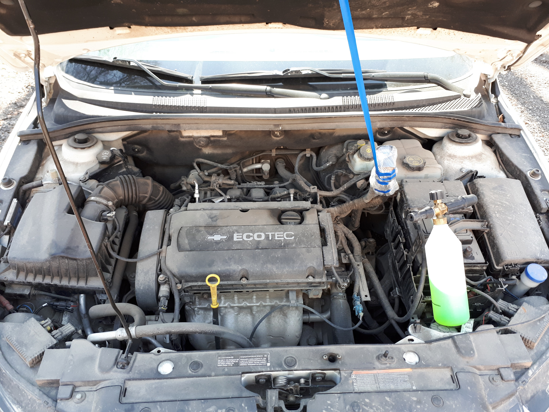 На все эти манипуляции уходит 5 минут максимум. Затем заливаю в пеногенератор без контактный шампунь и заливаю все подкапотное пространство пеной, затем маленько тру губкой легкодоступные места и смываю все керхером, естественно не направляю близко струю на разъемы и датчики. Затем собираю губкой воду под крышкой с надписью ЭКОТЕК, ставлю ЭБУ назад, снимаю пакет с генератора и Завожу и катаюсь немного чтобы немного продуло ДВС.
