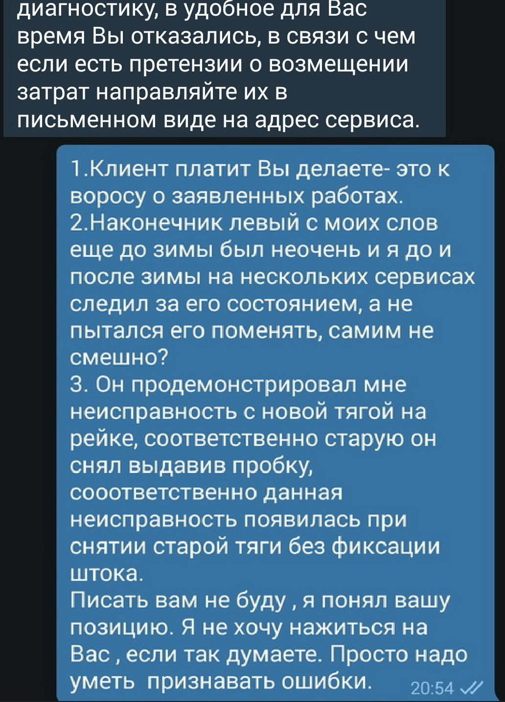 На мои заявления о том что их слесарь диагностировал при мне и я сам видел как он затягивал новую тягу, после демонстрации люфта штока, ничего не фиксируя- никакого внимания. Говорит приезжать на следующий день(рабочий) оставлять машину и они будут смотреть и решать что сломалось и за чей счет будет ремонт.
