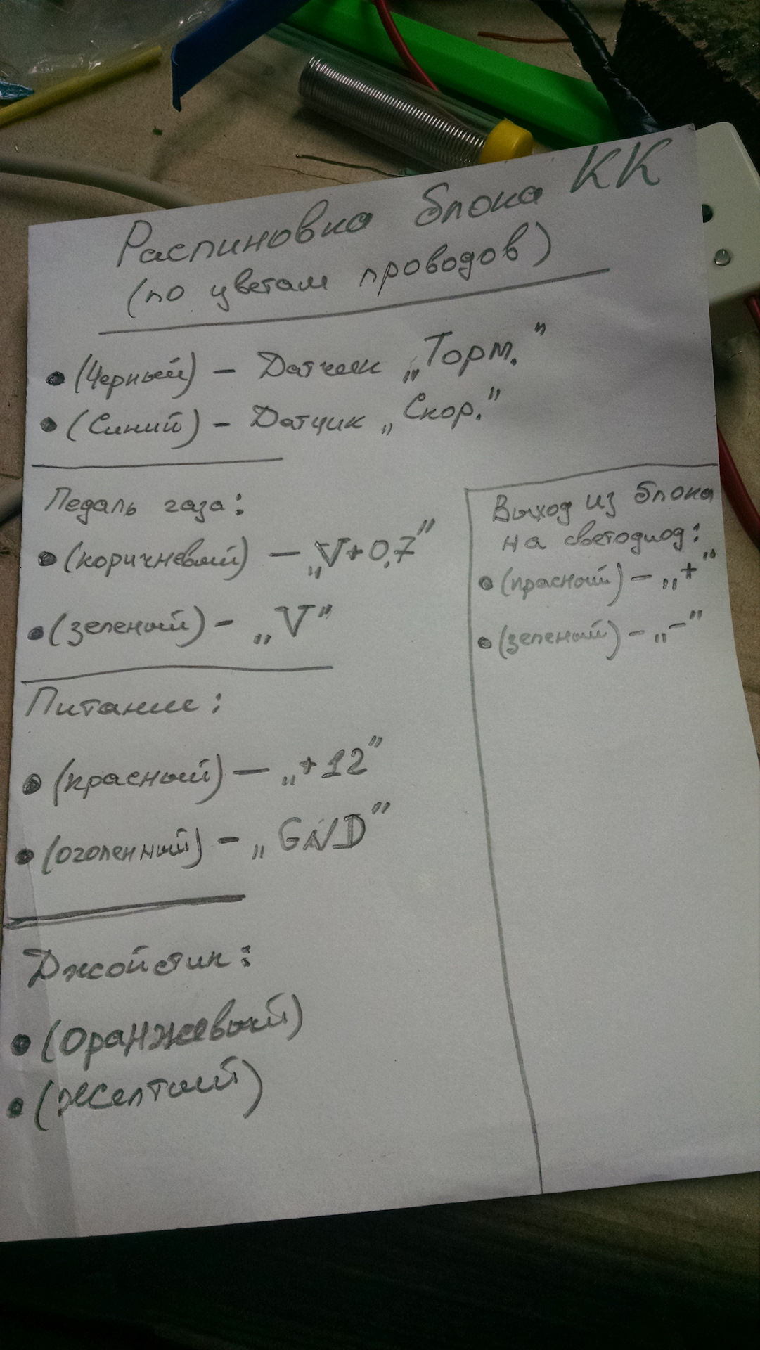 Неделю назад, была подготовка к установке и подключению блока круиз-контроля. В той подготовке была сделана небольшая ошибка…, а именно с подбором самого светодиода. В результате круиз работает, а светодиод не горит.((( Для тех, кто соберется себе ставить КК и подключить светодиод к самому блоку КК, напряжение на светодиод всего 2 Вольта. Я этого не учел…(( Короче, парни…- протупил. В итоге скоро поменяю светодиод, но запись делать не буду.