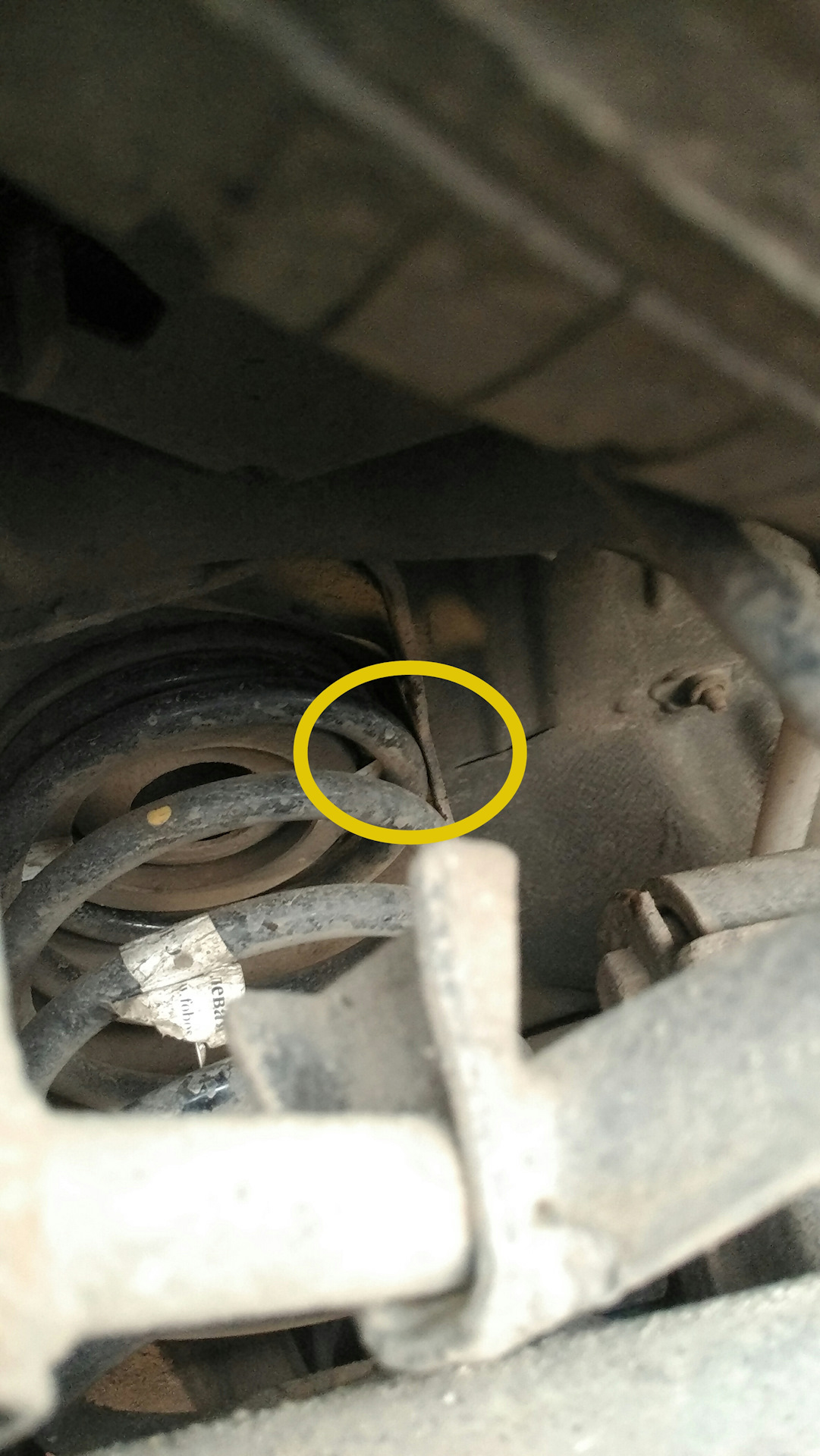 Полторы недели езжу на скрипучей машине, как телега деревенская блин! Что скрипит и откуда вообще не понятно было! Сегодня поехал в гараж пытаться найти источник скрипов. Скрипы по ощущения исходили с передка авто, но когда залез под машину ничего не нашёл криминального. Всю голову сломал, хотел было уже снова откручивать крепления кузова и поливать их силиконовой смазкой, но решил осмотреть ещё и заднюю подвеску. Вот тут я и нашёл этого гада! Пружина терлась витком об раму!
