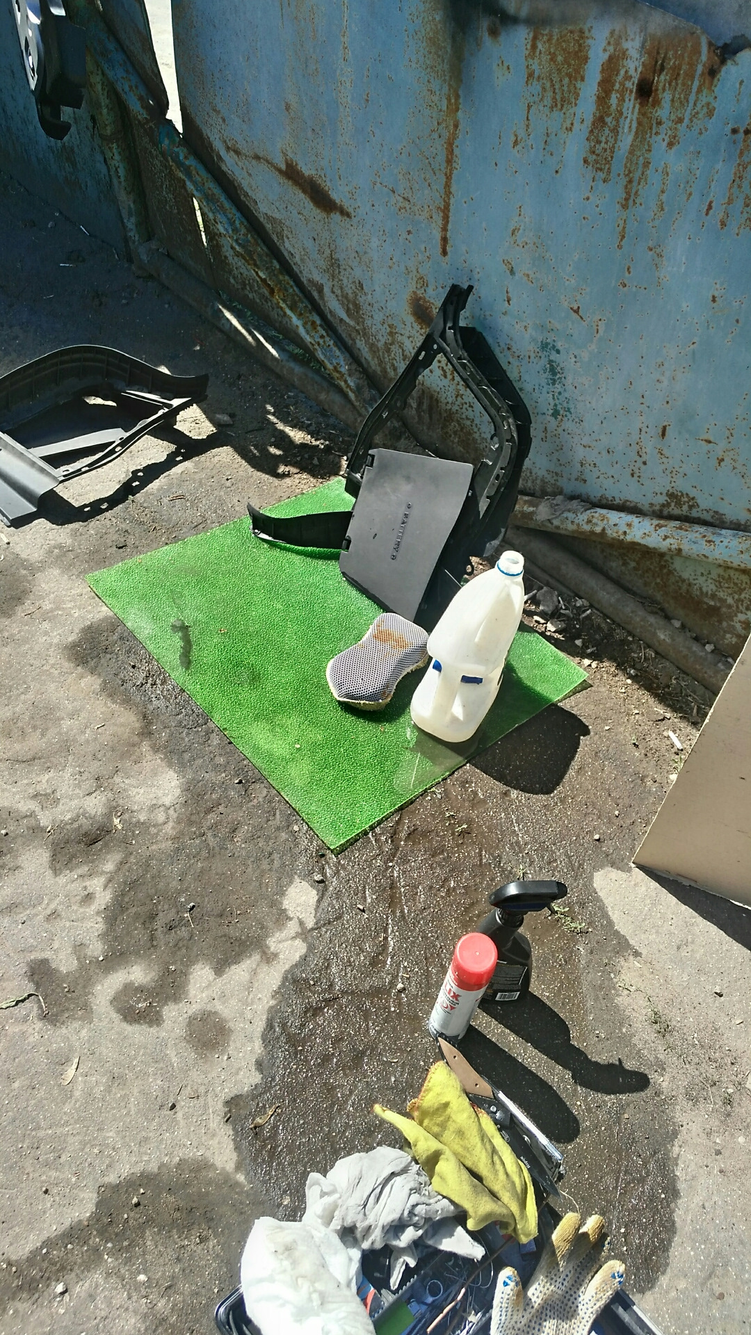 шкурка 3М медиум + почти нулевка…зачистил…обезжирил…грунт…2 слоя краски.KUDO черный мат. глянец не стал, т.к. большинство деталей экстерьера окрашены именно в мат( решетка радиатора, дифузор, маски фар, юбки бамперов.диски темная бронза под матовым лаком). Сохнет быстро… установка 5 мин…Все…устал…но приятное чувство от самостоятельного ремонта греет душу…))