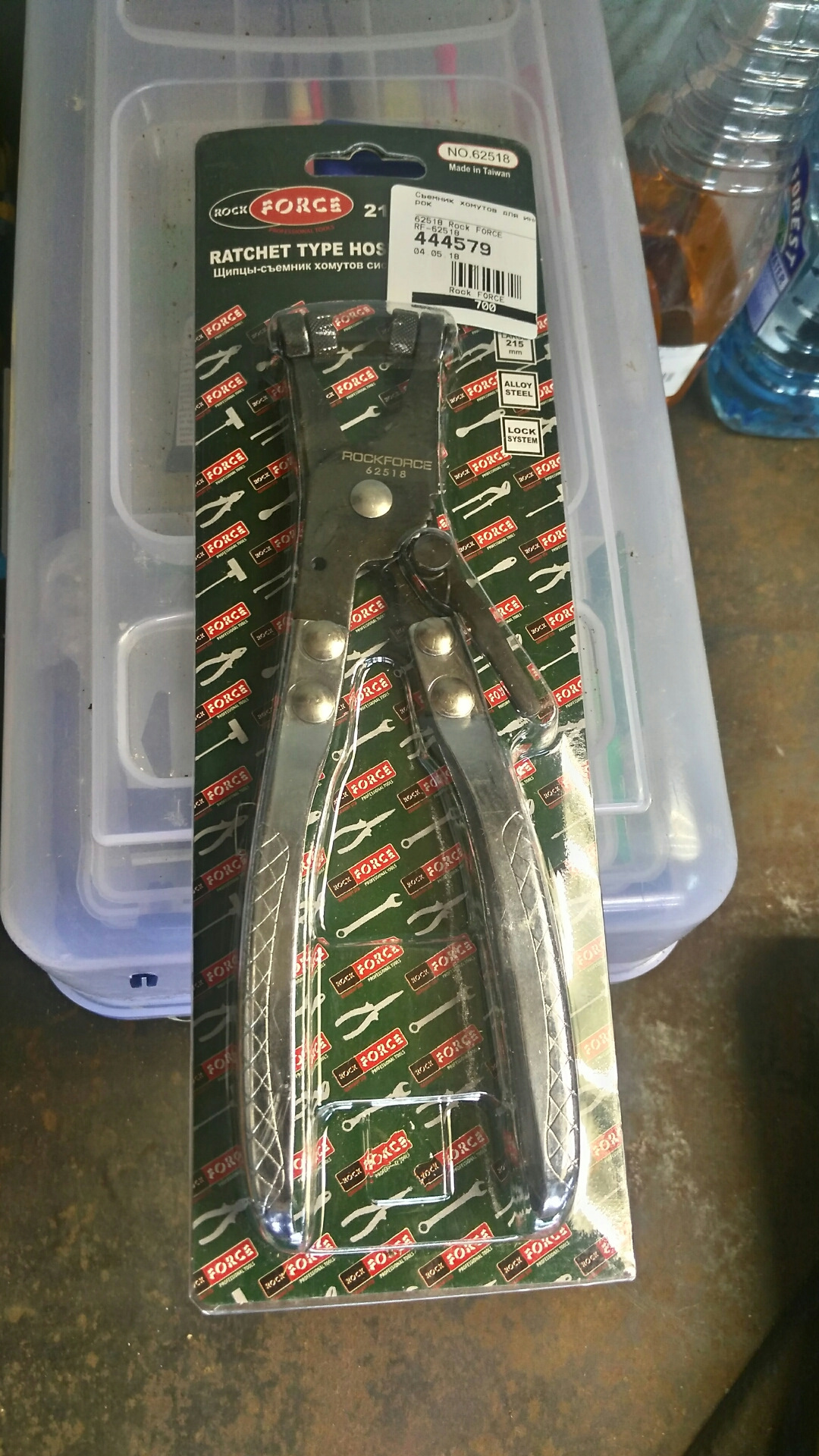 хотел снять обжимной хомут, чтобы вынуть половинку втулки…не получается…замерил линейкой .внутренний диаметр около 1,5 см…на улице темно. еду в ночные автозапчасти (Планета железяка выручает не первый раз)…Нахожу витрину с различными соединениями патрубков…покупаю металлическую втулку 16 мм(60 руб) + съемник хомутов(700руб)…антифриз есть в гараже…