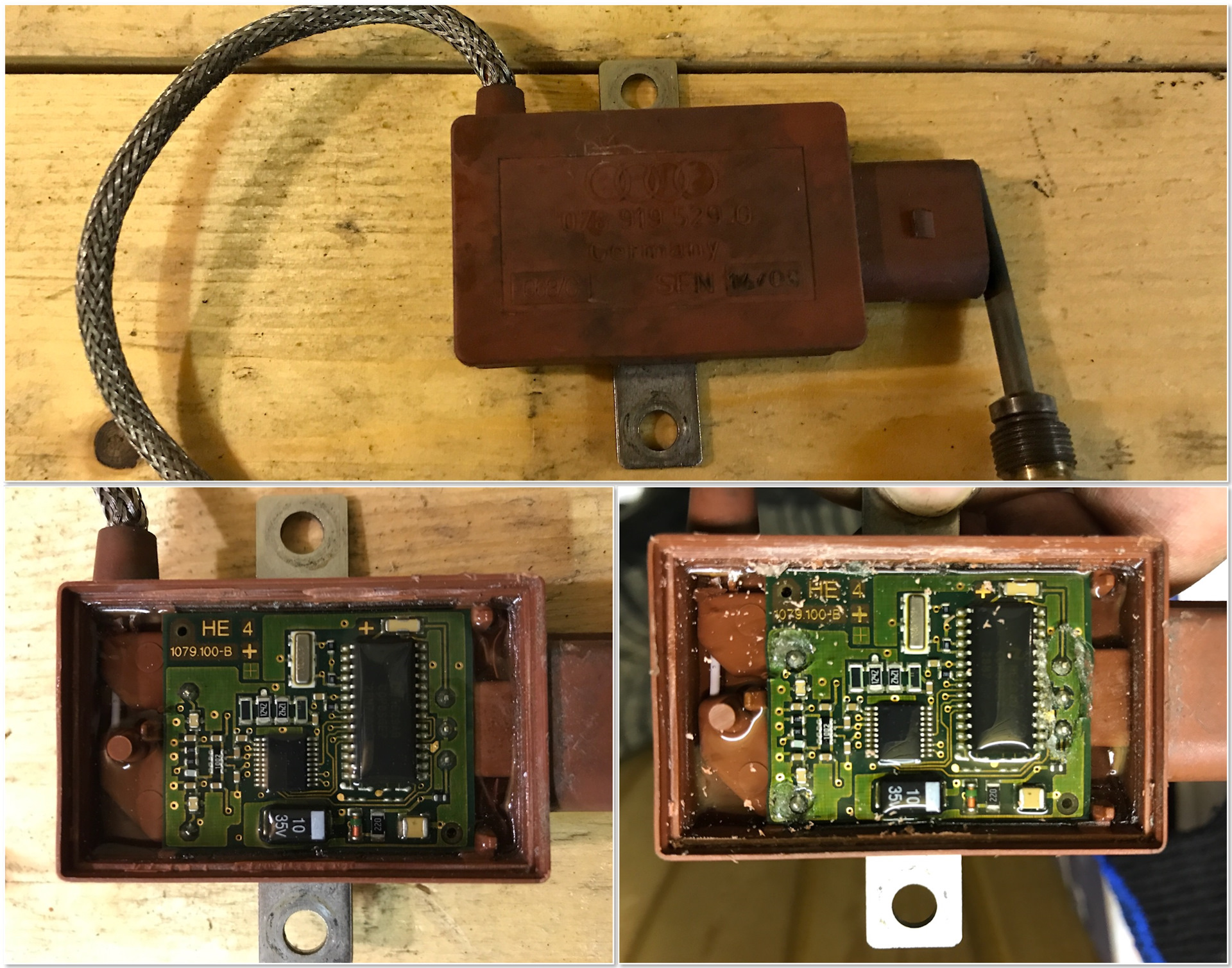 Не стал паять по месту — снять датчик дело 5 минут, на фото вскрыт/разобран и пропаян — можно пихать назад в авто.