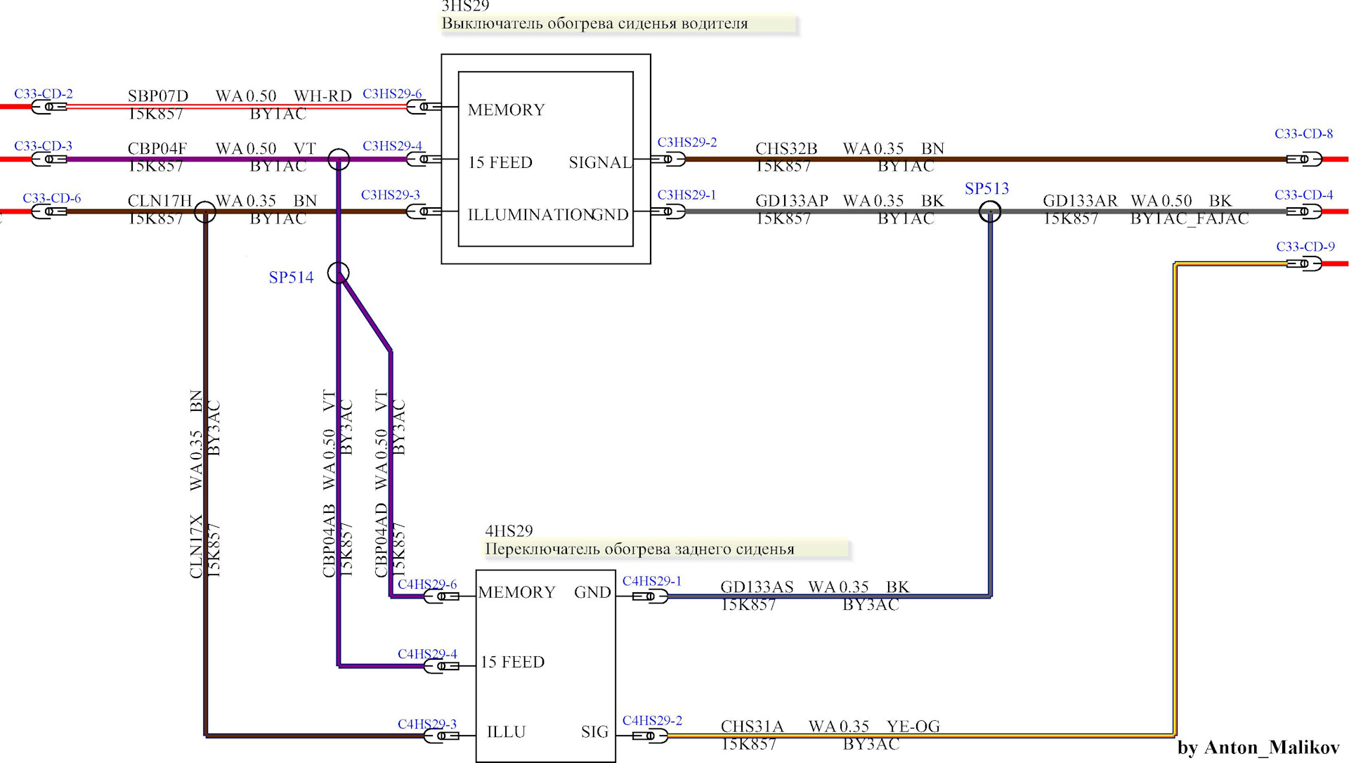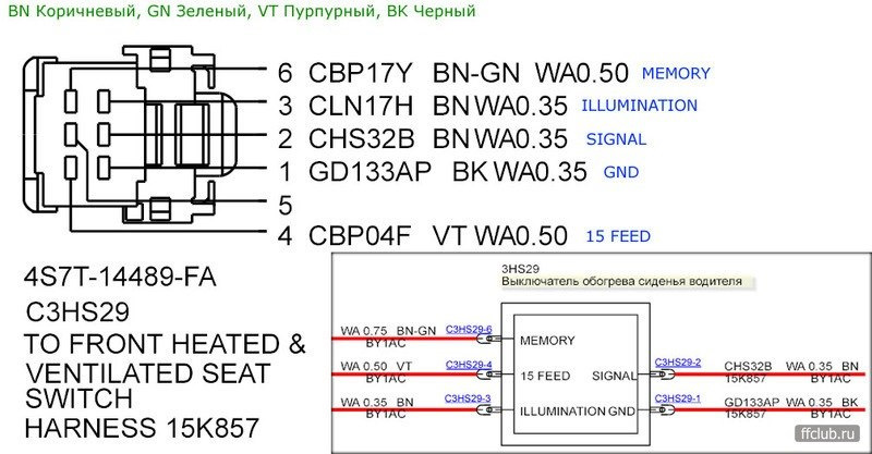 По схеме все обозначения соответствуют МЭК 757-83. Путем простого анализа, получаем что необходимо дополнить жгут всего одним желто-оранжевым проводом, и привести 3 остальных провода до переднего блока кнопок обогрева. Схематично это выглядит так, новые проводники обведены синим цветом.