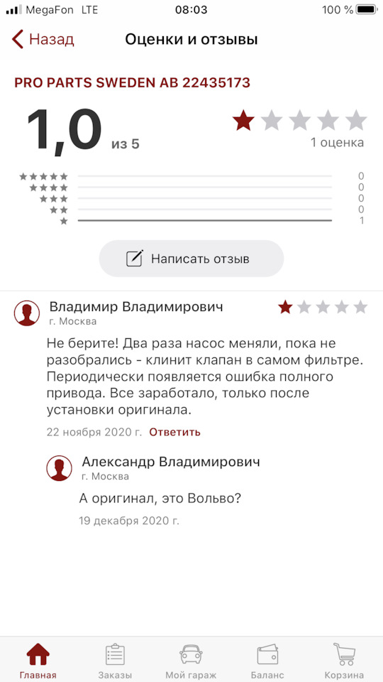 Про фильтр PRO PARTS SWEDEN AB 22435173 есть какие нибудь отзывы?