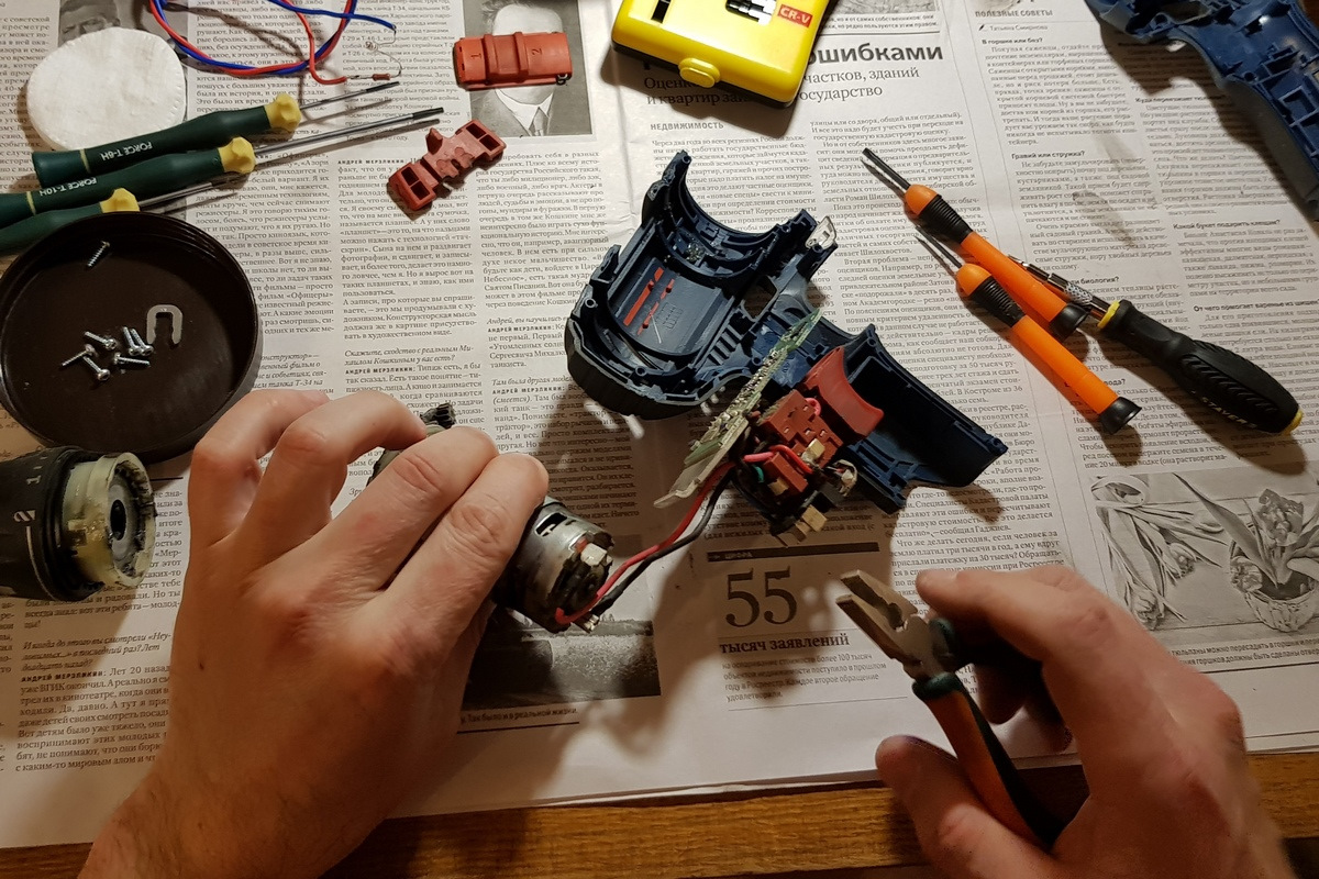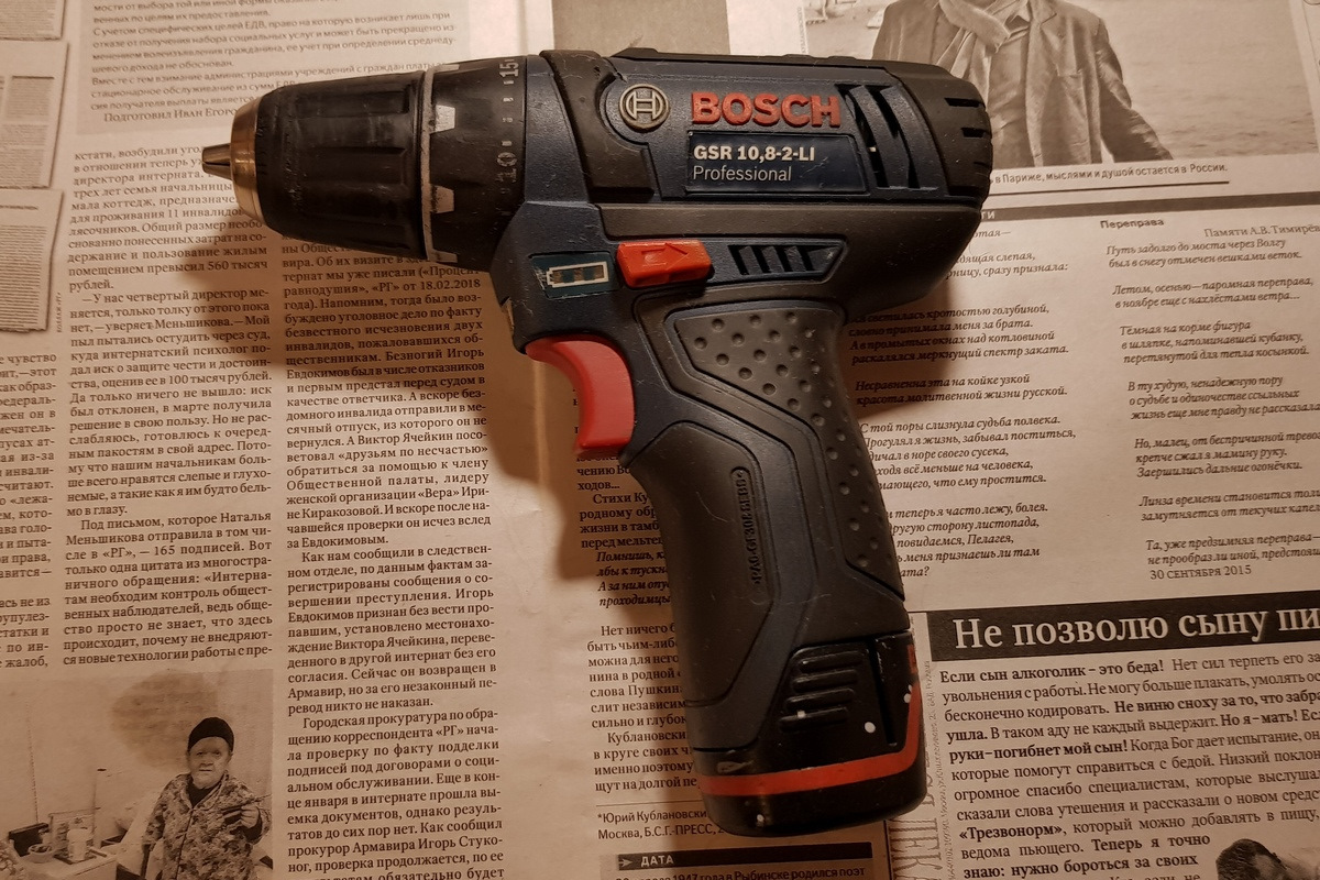 Начну с простого. Есть у меня комплект малогабаритных инструментов BOSCH профессиональной «синей» серии, в комплекте: обычный шуруповерт, ударный шуруповерт, сабельная пила, шлифмашинка и LED-фонарик. В комплекте было 3 литиевых АКБ, зарядное устройство и фирменный ящик. Все это добро я брал со скидкой, по акции ВСЕГО за 12000 руб. Сейчас посмотрел, один только шуруповерт стоит порядка 9000руб. А я его очень часто использую (удобно). Провел профилактику.