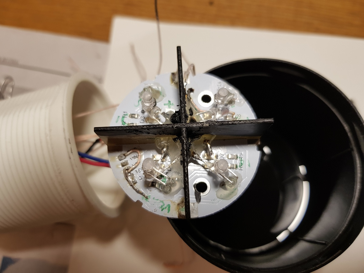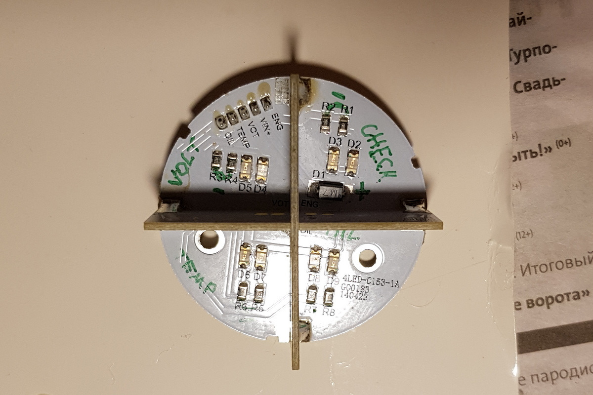 Перейдем к прибору 4-х секторному, тот что был без подсветки. По совету моего подписчика и грамотного советчика по проекту: vs-495 сделал 2-х цветную подсветку прибора, отвечающего за 4 события. Я конечно и сам видел, что не по фен-шую прибор вписывается, ждал чтобы кто-нибудь "пнул" :) Разобрал прибор, он естественно простой, всего по паре smd-светодиодов на каждый из 4-х секторов: