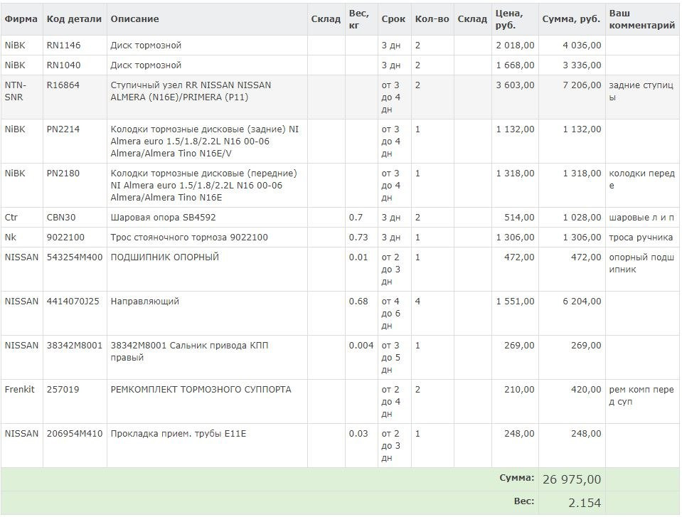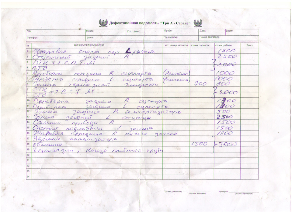 Что касаемо списка запчастей и работ. Текстом: 1. Шаровая опора переднего левого рычага 2. Ступичный задний правый 3.Передние тормозные колодки + передние тормозные диски 4. Переборка передних суппортов (ремкомплект) 5.Задние тормозные колодки. + задние тормозные диски 6. Переборка задних суппортов (ремкомплект или направляющие?) 7 «. Замена заднего правого амортизатора 8. Замена задней левой ступицы 9. Сальник привода правый 10. Опорный подшипник правый 11. Шаровая переднего правого рычага 12.Удаление катализатора + обманка + 2 прокладки, кольцо приёмной трубы.: