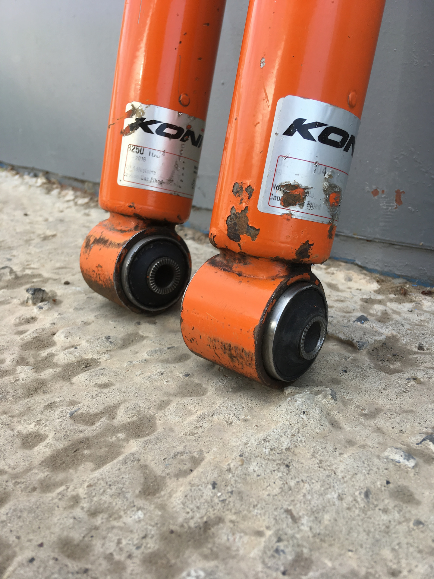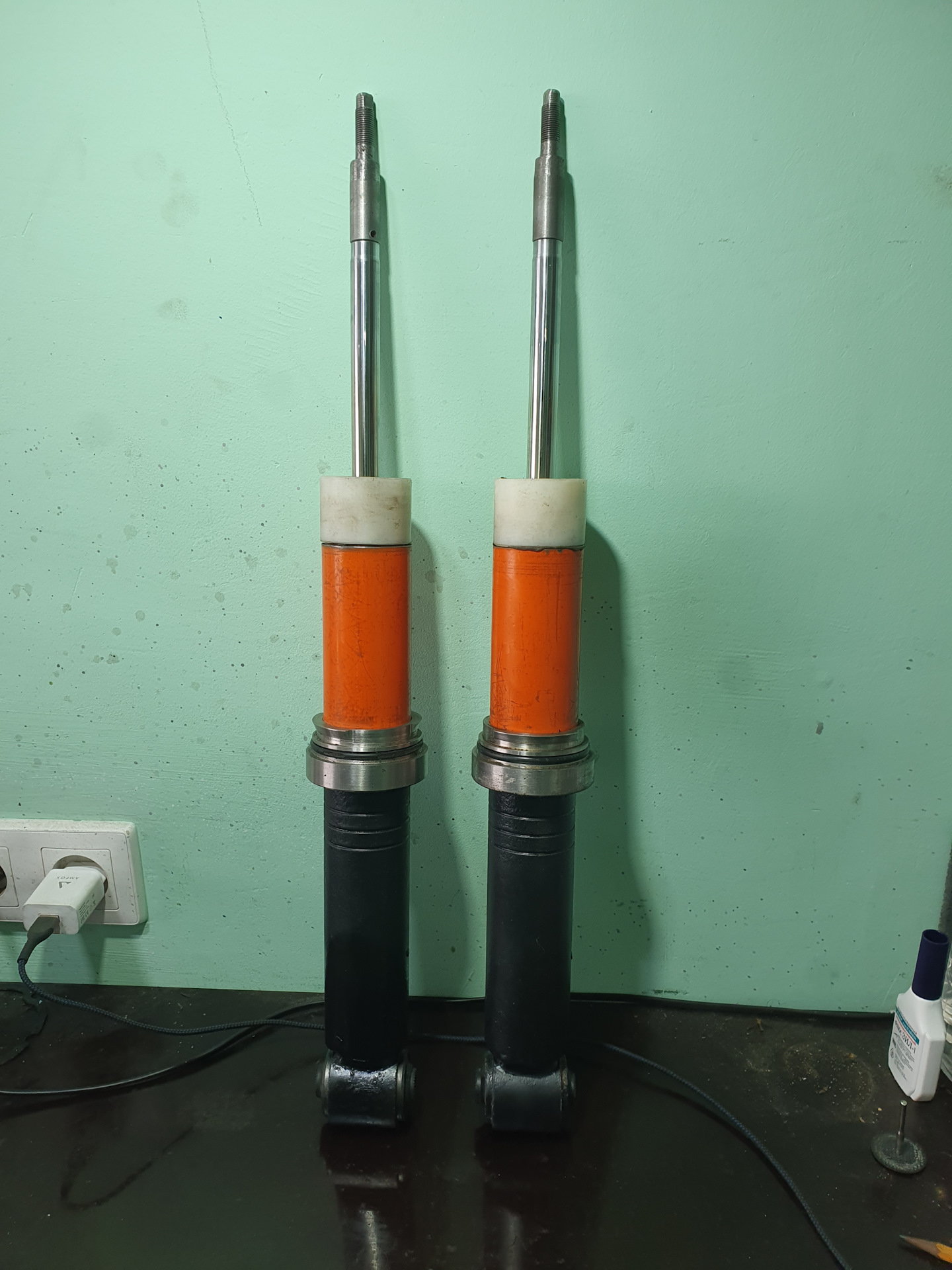 Передние конечно тоже поржавели, но не так сильно как задние. С передними тоже есть история: когда менял баллон, не помню какой, очень тяжело откручивалась верхняя гайка, разбирал где-то на асфальте, не придумал ничего лучше, чем держать за шток трубным ключом, короче я этот шток немного подрал, ну и превентивно я оба поменял на такие же, пробег на тот момент у них был где-то 120 тыс, оба сухие, с ними все хорошо. Сейчас лежат в ЗИПе.