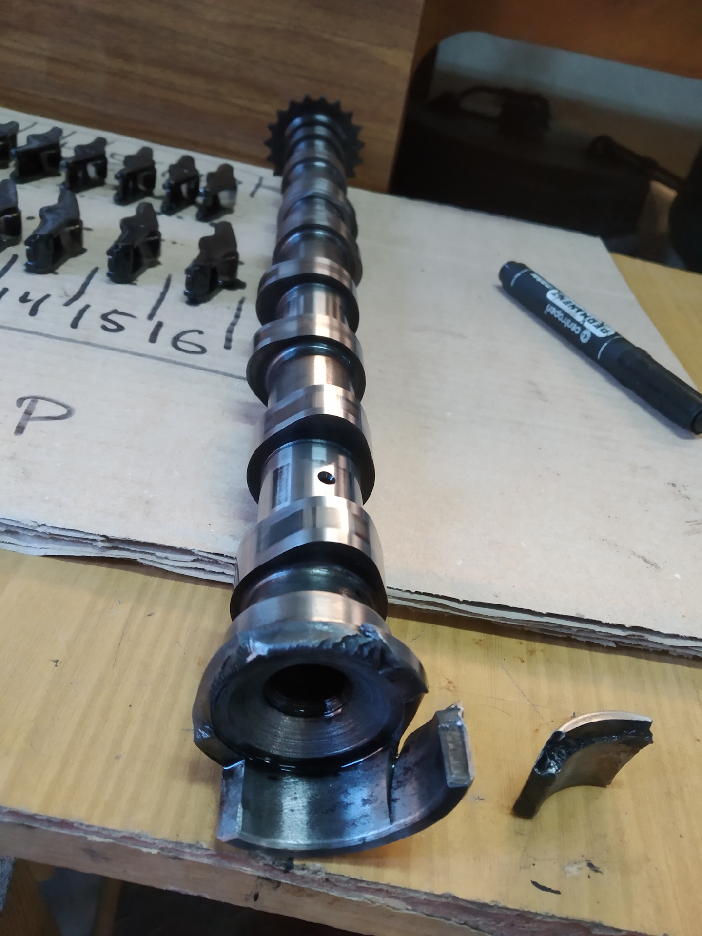 Открутив крышку, она не снимется, её аккуратно придётся срывать, т.к. она держится на герметике. Оторвав крышку, вытаскиваете распредвалы и видите рассыпанные рокера. Очищаете от металла, не забудьте закрыть все все отверстия тряпками, что бы металл не попал внутрь двигателя.