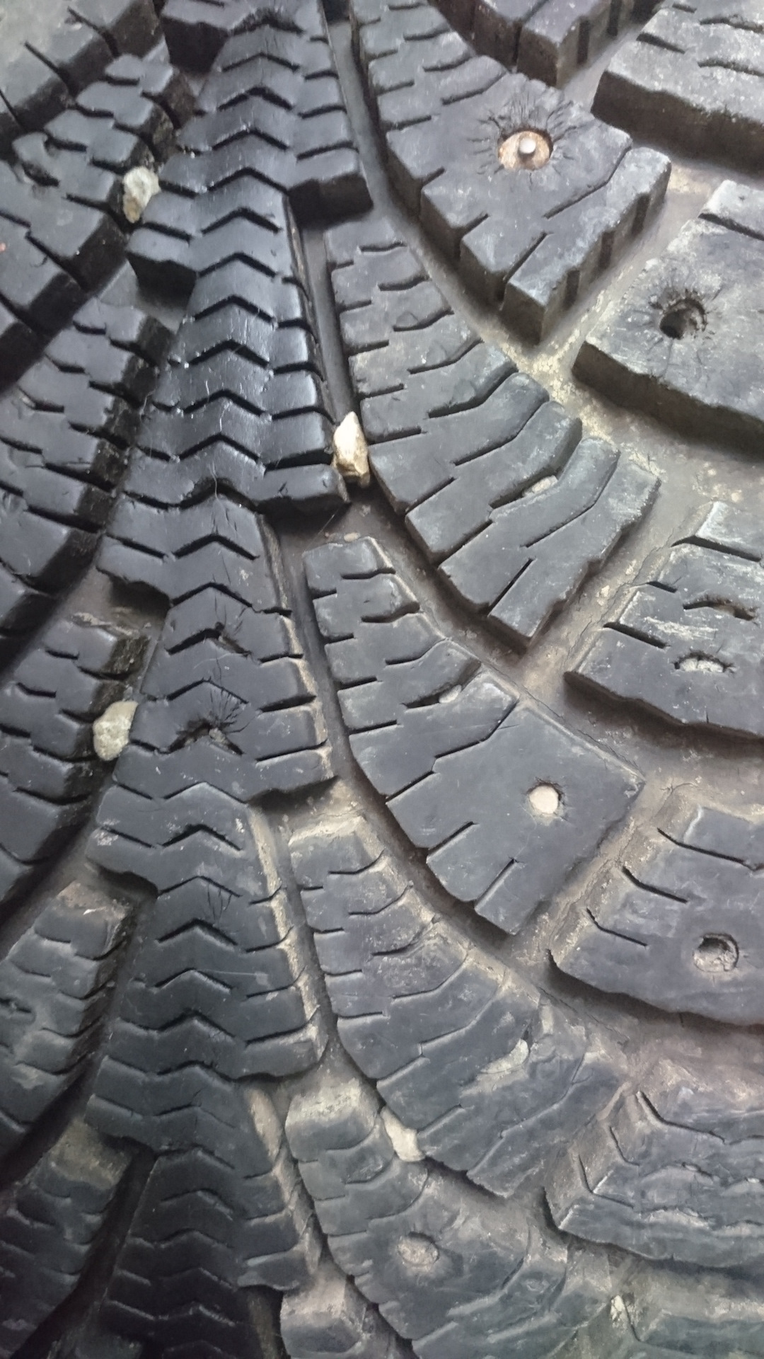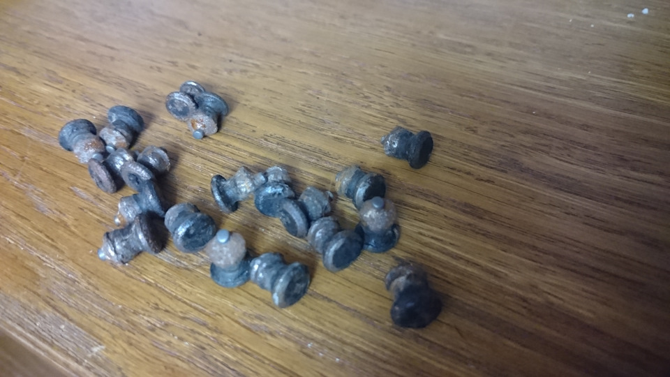 Занёс резину домой, предварительно помыв её на мойке. Полежав дома пару недель я начал выковыривать шипы (в среднем осталось по 10 шипов в каждом покрышке), камни и камешки в ламелях. С каждого колека было выковырено около 100 гр камней, стекла и тд. Большинство отверстий под шип были разбиты, их я продувал, вычищал и понеслась процедура ошиповки!