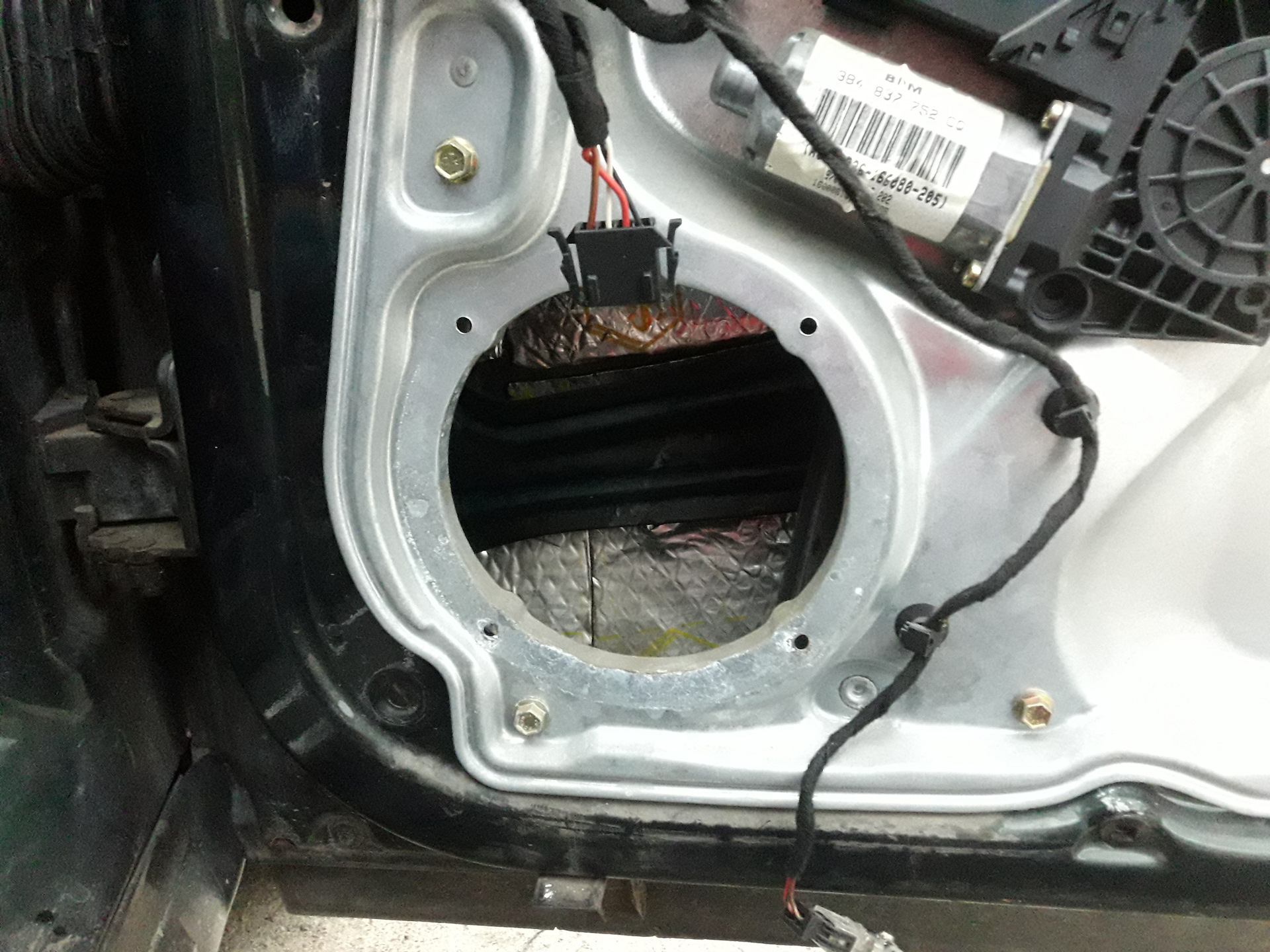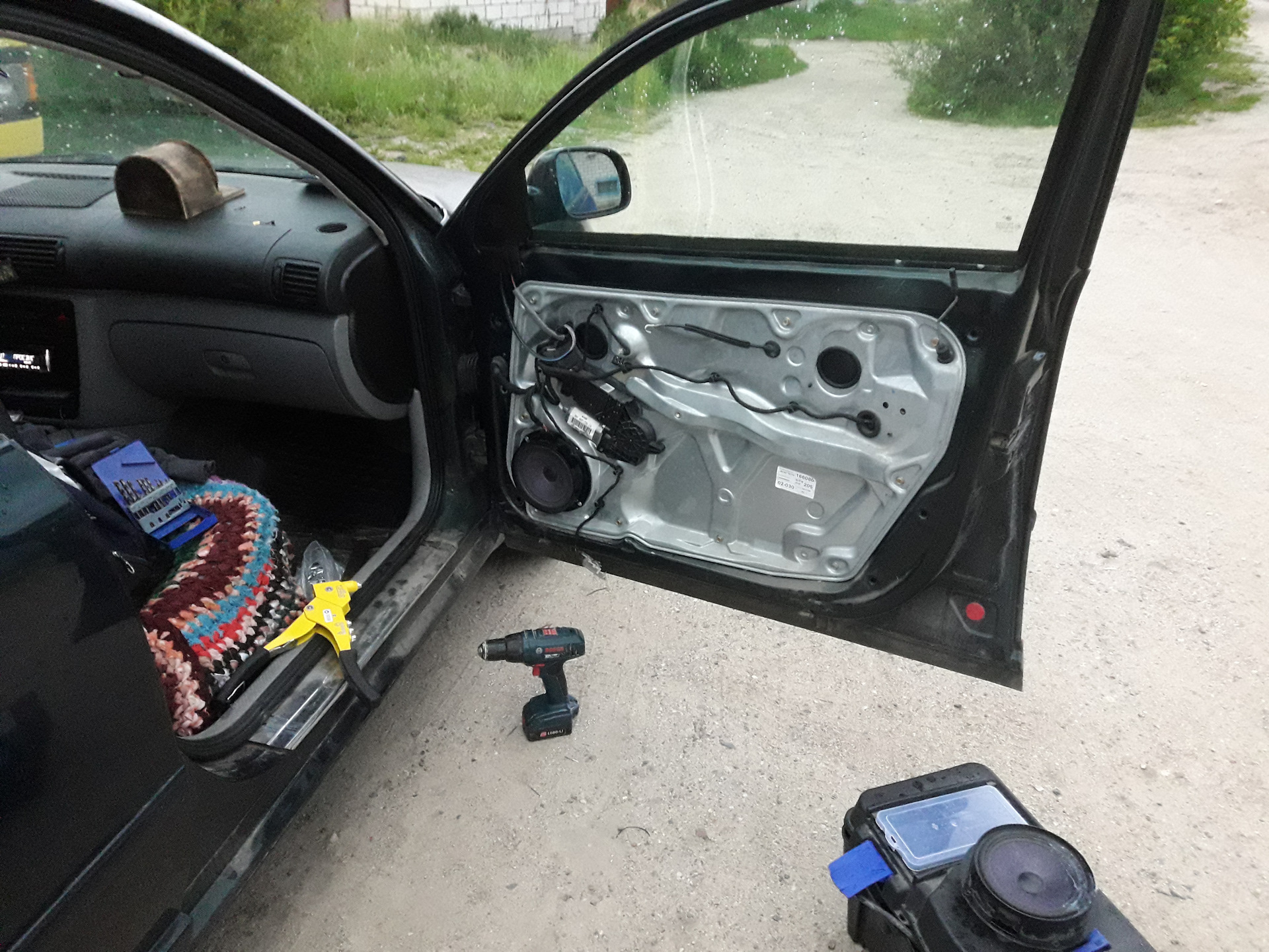 1. Снимаем защиту двери ( 2 винта под торкс снизу; отщелкиваем защиту ручки двери; откручиваем в ней 2 винтика под крестовую отвертку; отщелкиваем карту двери с клипс; чуть подымаем вверх и отводим на себя; снимаем фишки : с нижней подсветки, с кнопки стеклоподъемника, с динамика; отсоединяем тросик открываня двери от ручки).