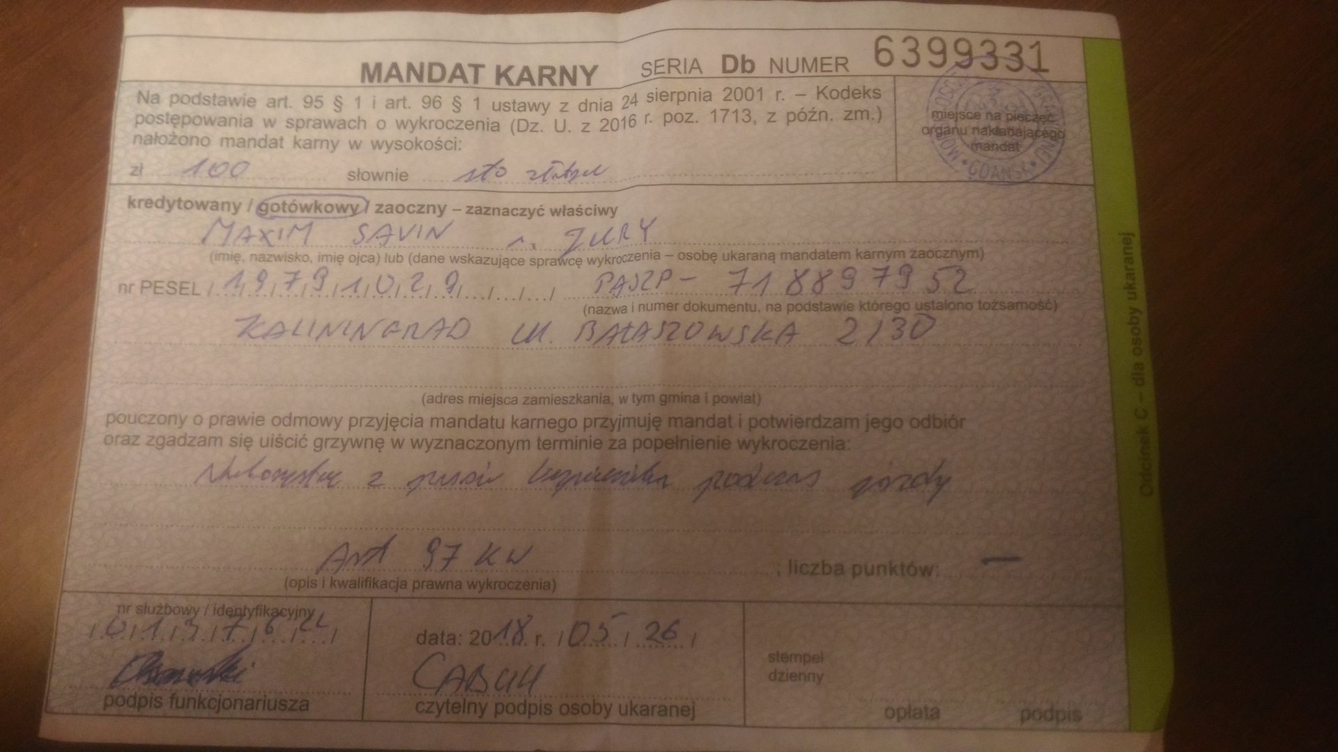 Потратили мы минут 20 на них. Выписали мне штраф (не пристегнулся ремнём безопасности)))) и взяли на месте 100 злотых (1 700 рублей)))