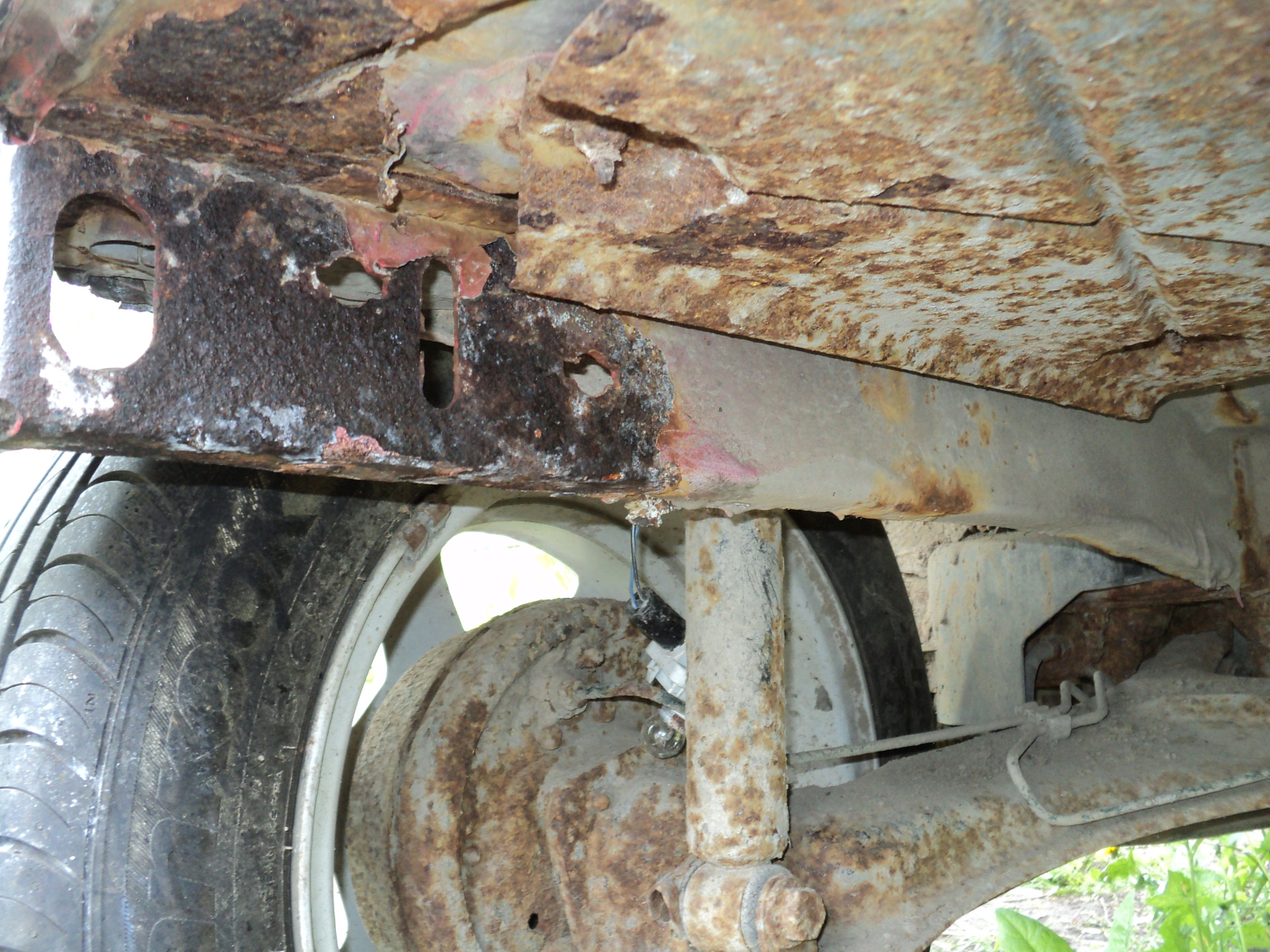 Перешел к задней части автомобиля. Ревизия выхлопной системы выявила еще несколько оригинальных конструктивных решений. Кронштейн крепления глушителя на левом лонжероне (фото 2, слева) представляет собой очередной влагопылесборник под машиной. Результат его деятельности более, чем печальный (фото 3).