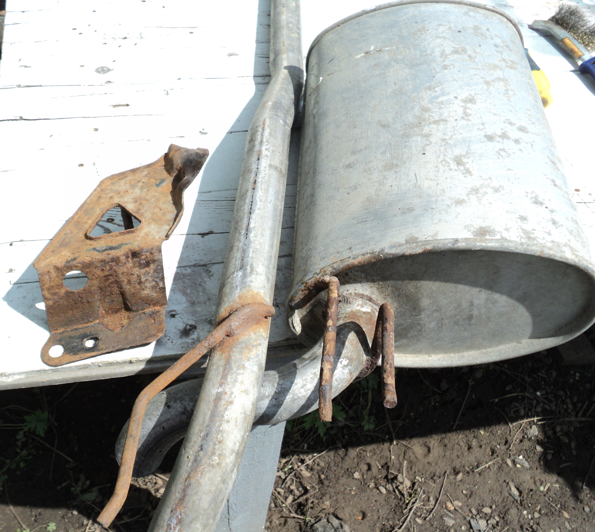Выхлопной тракт приведен в порядок (почищен, оцинковка восстановлена по всей площади), а вот с кронштейном и всем, что он натворил предстоит еще бороться… Ну, с лонжероном и днищем все понятно — обдирка до чистого металла, оцинковка и т.д. А вот кронштейн нужно ликвидировать. Вопрос к знатокам: кто-нибудь от него избавлялся? Чем заменял? Буду благодарен за советы и обмен опытом.
