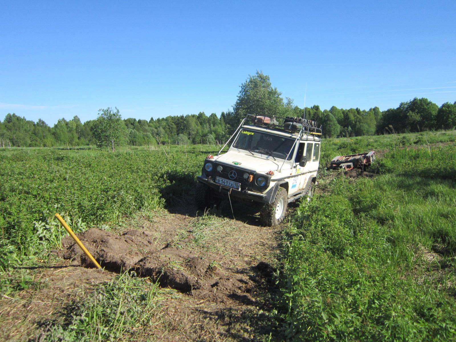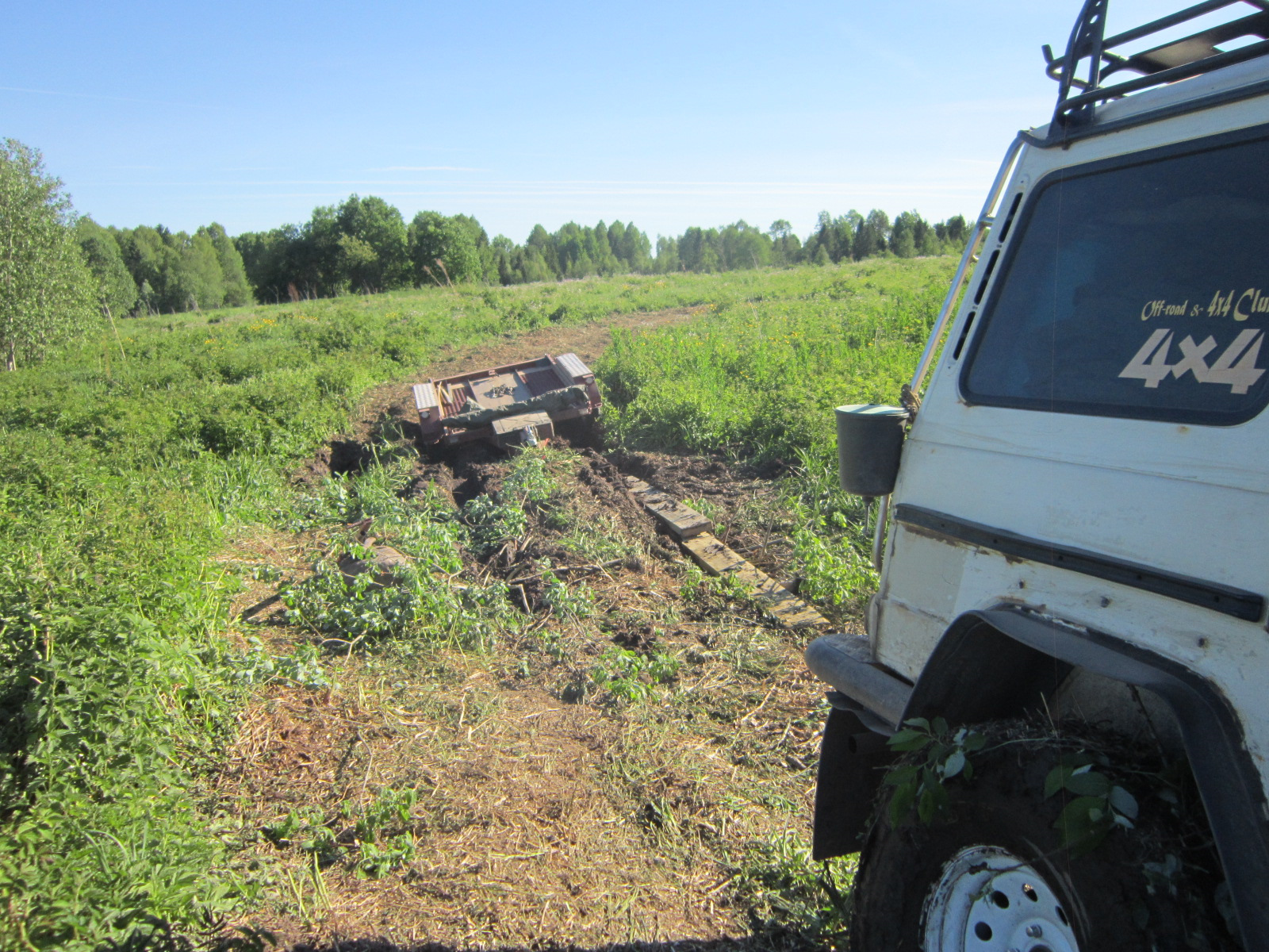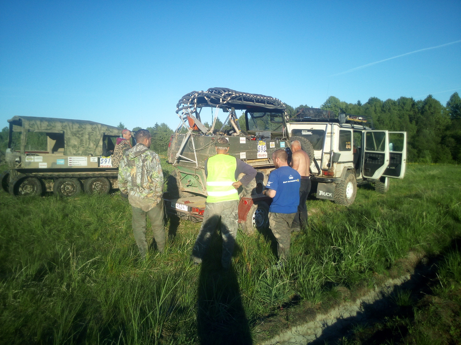 Когда добрались до поля, Техничка уже выехала посредством закапывания бревна поперек и мы решили подкрепится. Настало 7 вечера. То есть прошло 7 часов со старта, финиш закрыт, мы прошли где то 14 км с ремонтом . Совсем немного.