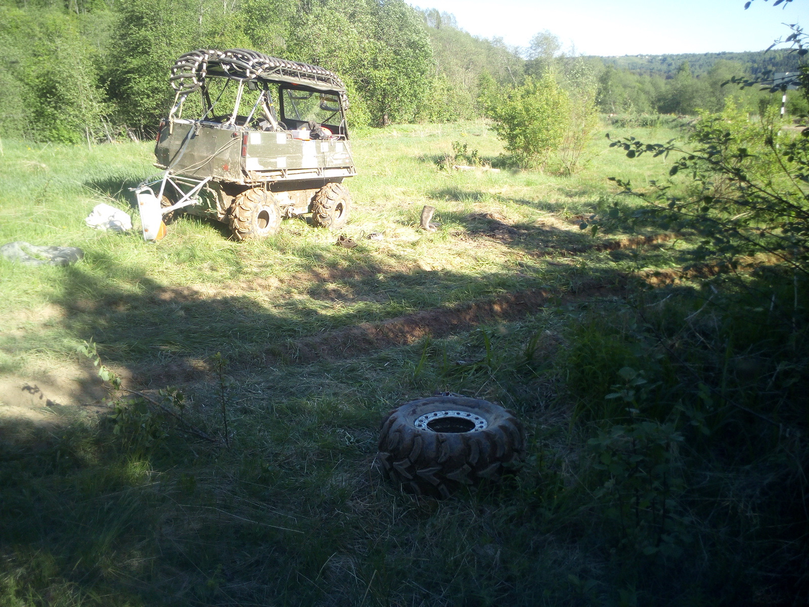 , Поглядели как машины выбираются обратно, как пионер прошел по болоту и скрылся в лесу и прикинув что шансов проехать еще 40 км этой колее для нас просто нет, а сидеть пару дней в лесу совсем не хотелось, скоординировали техничку на перехват, поехали к ней обратной дорогой . На одной из гор резанули колесо о камень острый, а второе погнули диск. На полянке я поменял камеру.