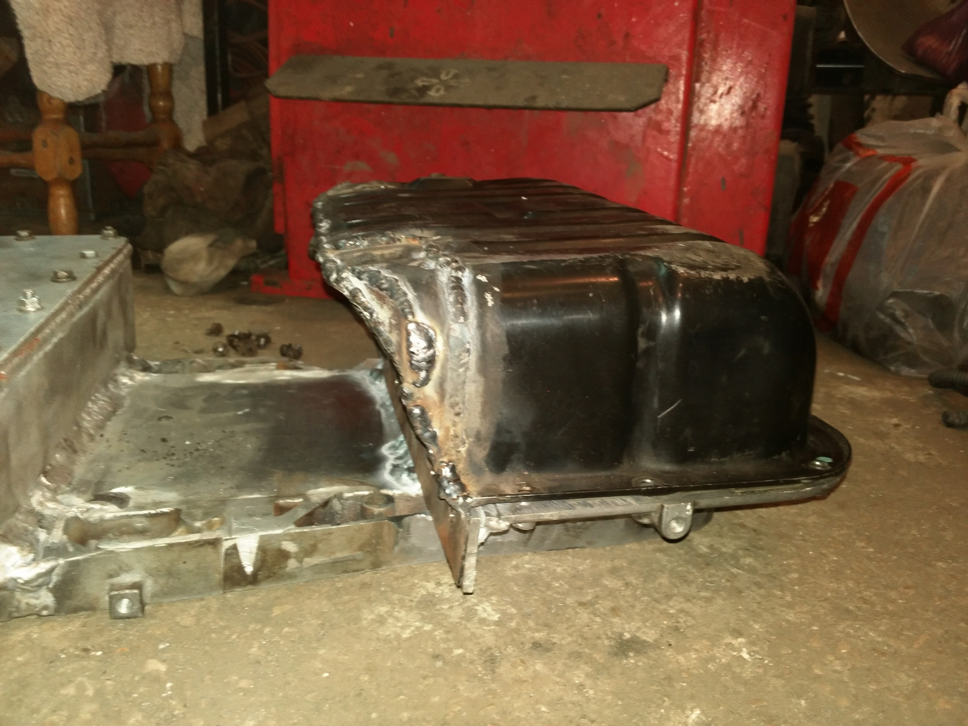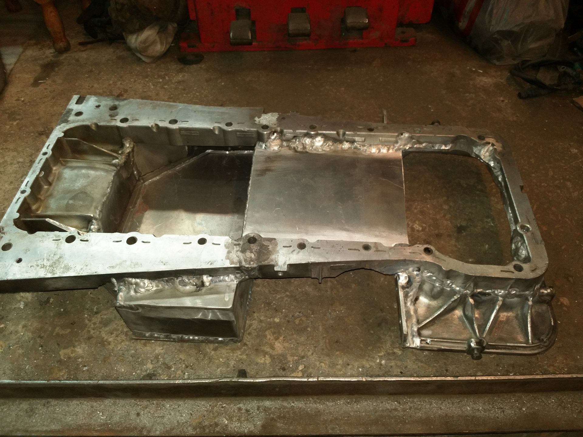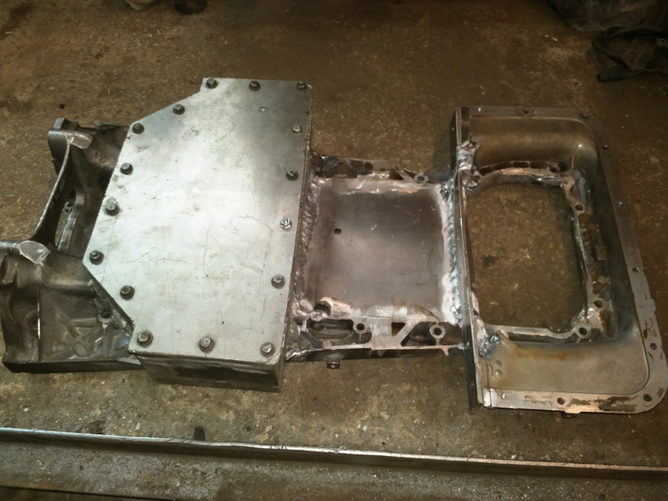 Доделали поддон. Почти. Общие черты понятны. Решил я не заморачиваться с сухим картером, а оставить родной маслянный насос с приёмником. По этому такая форма. Поддон "обтекает" рулевую рейку.
