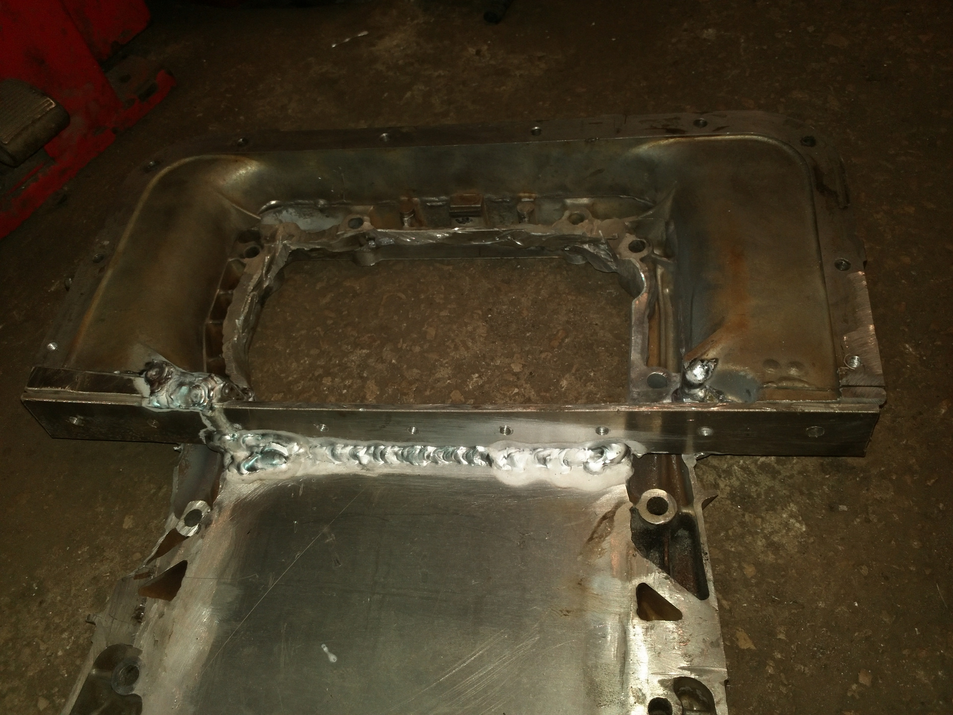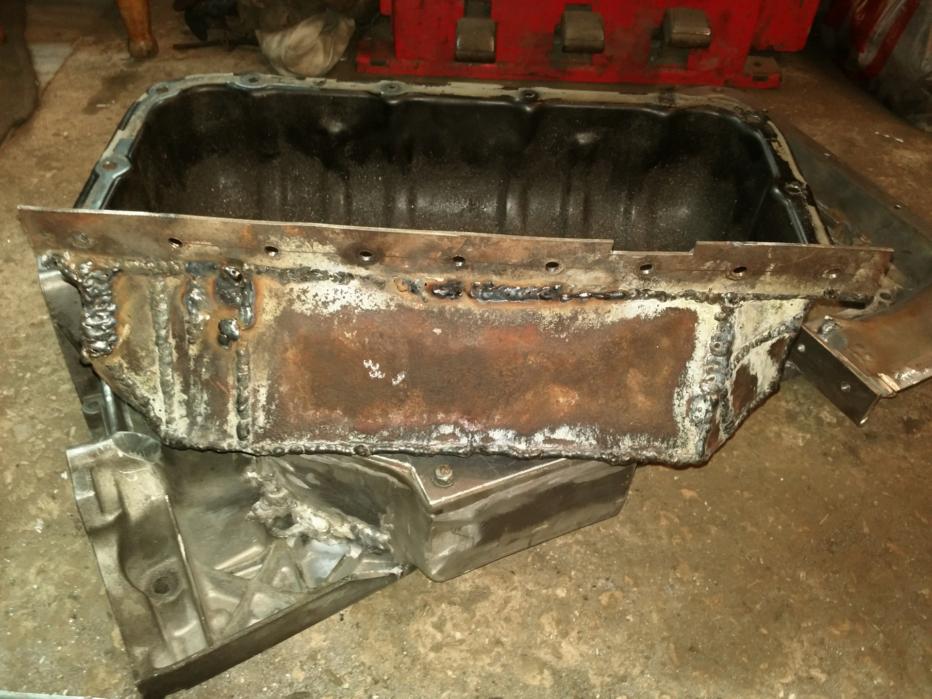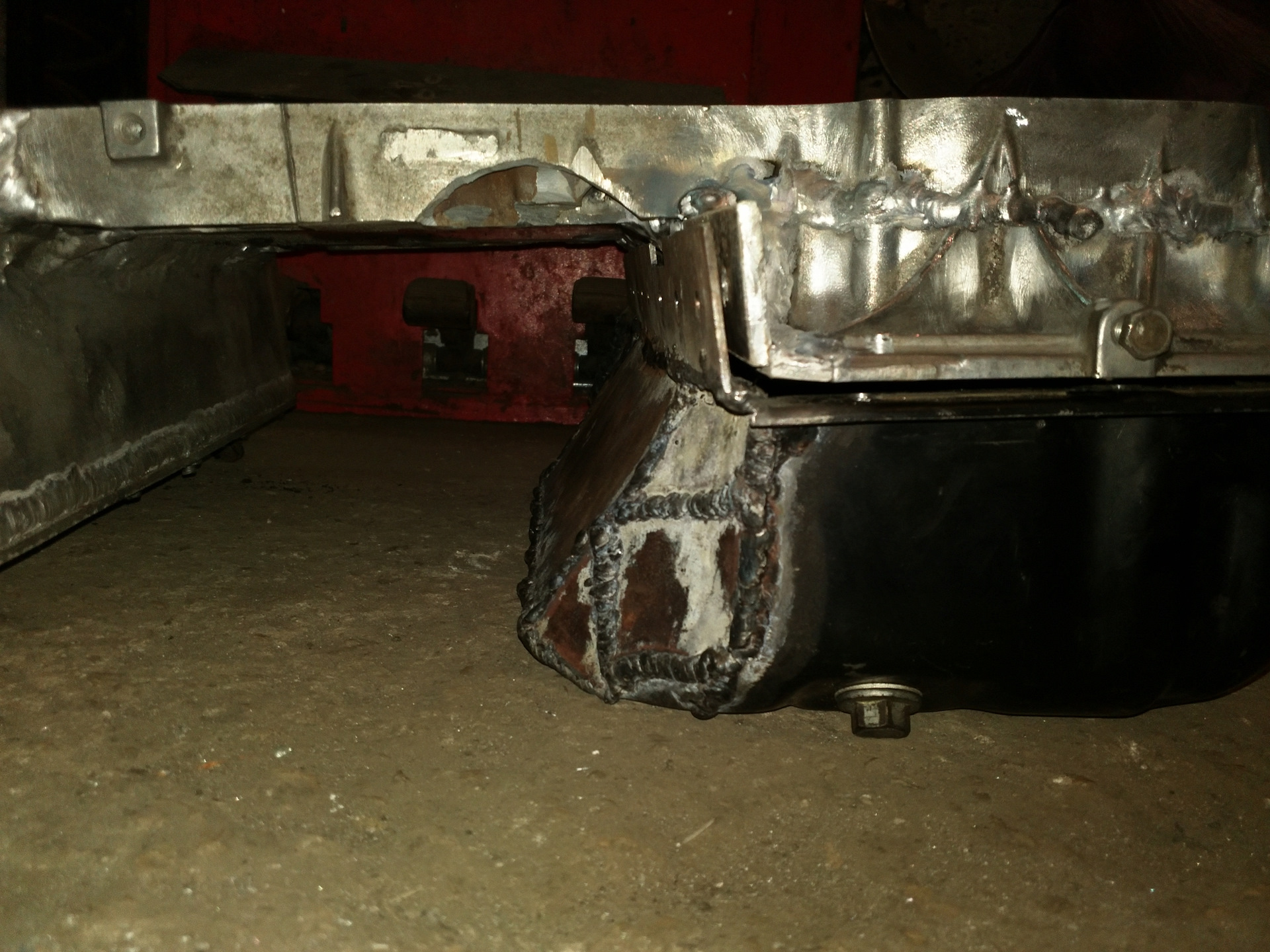 Доделали поддон. Почти. Общие черты понятны. Решил я не заморачиваться с сухим картером, а оставить родной маслянный насос с приёмником. По этому такая форма. Поддон "обтекает" рулевую рейку.