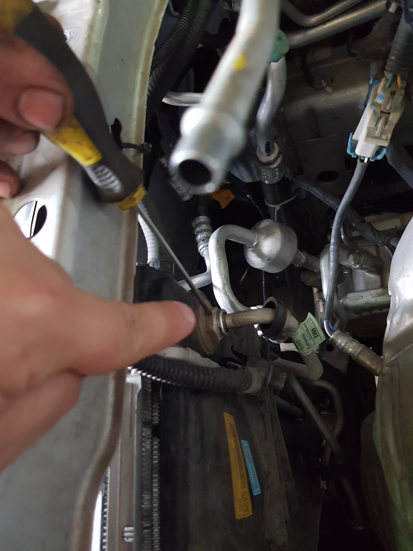 Ребята отсоединили верхнию трубку с радиатора, и в этом ошибка. При таком варианте не промывается теплообменник в радиаторе. Датчик мы откручиваем который ближе к АКБ.