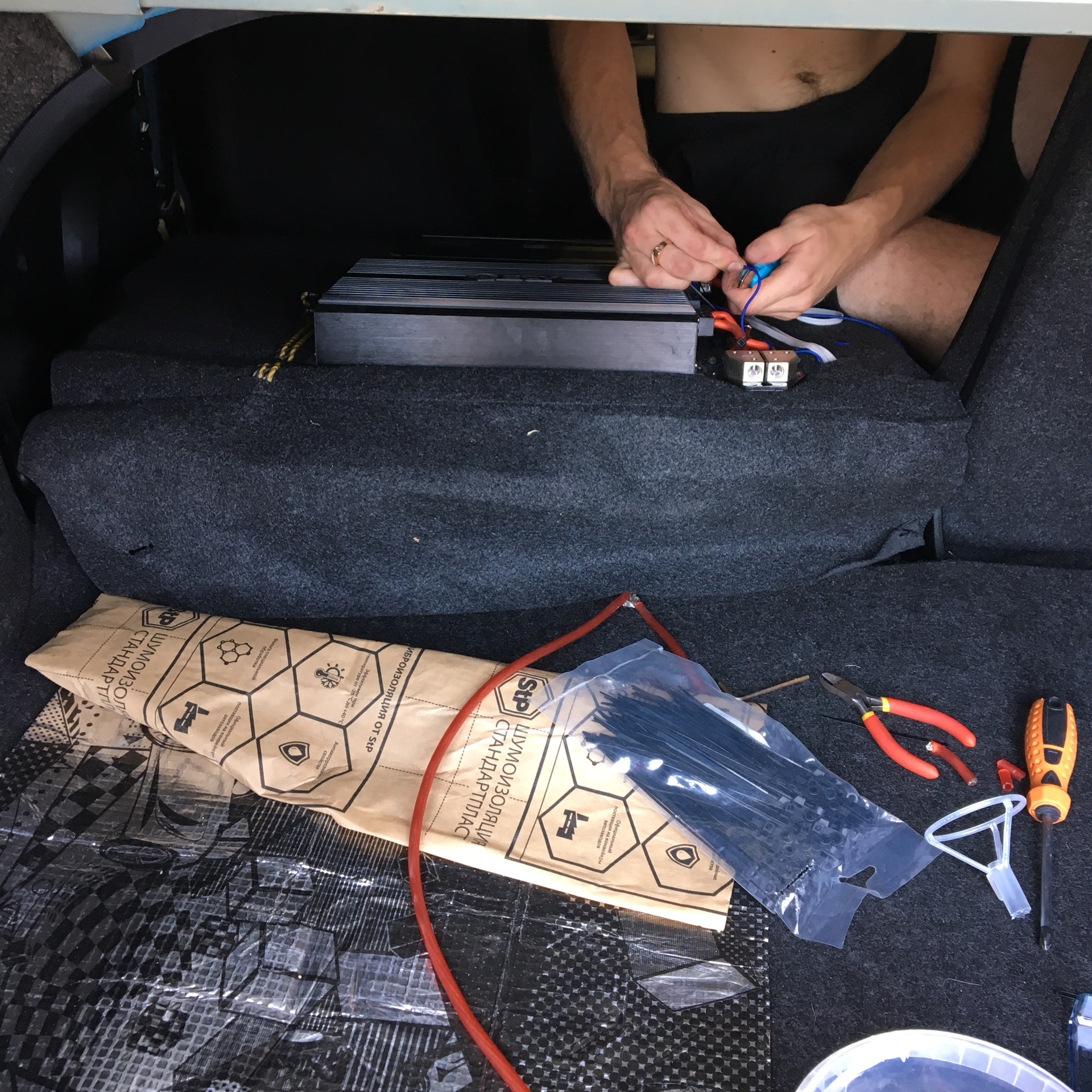 Всем привет, заменил я штатку в передних дверях, были куплены эстрады фирмы fsd, сзади оставил родные, сабвуфер остался с бывшей машины, поставил его сюда, занял он пол багажника, место мало, да и играл он через чур сильно, с улица сильно слышно было и ощущение было что сейчас все развалится, было решено ставить что то поменьше, обменял его у друга в автозвуке, на Саб фирмы magnum, размер 10, до этого fsd размер 12 ну и конечно же были установлены усилитель и моноблок, плюс ещё брал преобразователь для того чтоб оставить штатную магнитолу, теперь играет приятно, самое то )